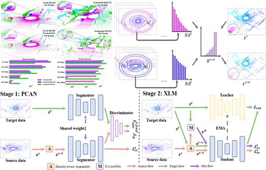 三维点云无监督域自适应分割可有效减少繁重且昂贵的人工数据标注成本。本文设计了一个基于统计的密度指导转换器来解决因不同传感器之间采样模式不匹配所引起的点密度不匹配问题。其通过为每个域生成与其它域相似的点云扫描,以在输入端缩小域差异。并在此基础上,提出了DGT-ST双阶段点云跨域分割框架。相较于当前最先进的方法,DGT-ST在两个公开的合成到真实(SynLiDAR->semanticKITTI 和 semanticPOSS)UDA分割数据集上,分别实现了9.4%和4.3%mIoU 的性能提升。