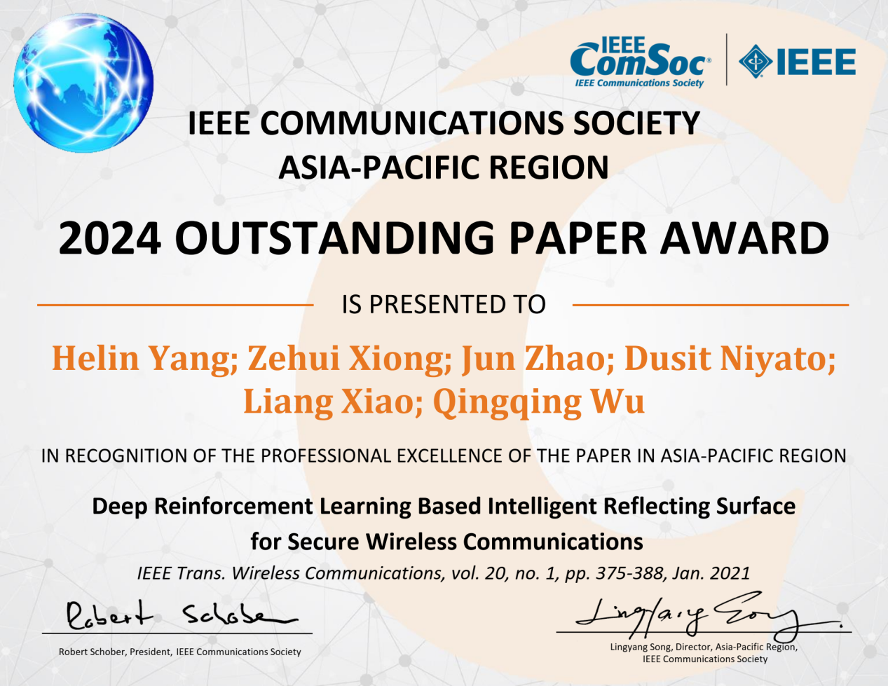 近日,厦门大学信息学院杨和林副教授、肖亮教授,新加坡南洋理工大学Dusit Niyato教授、Jun Zhao教授,新加坡设计大学熊泽辉教授和上海交通大学武庆庆教授合作发表于厦门大学A类期刊IEEE Transactions on Wireless Communications的论文“Deep Reinforcement Learning-Based Intelligent Reflecting Surface for Secure Wireless Communications”获得2024年度IEEE通信学会亚太杰出论文奖(IEEE ComSoc Asia-Pacific Outstanding Paper Award)。