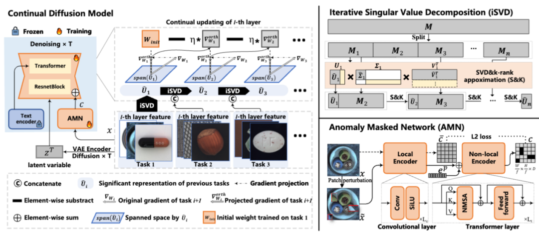 简介:随着生成模型的兴起,在生成框架内统一所有任务的趋势日益增长。生成类方法在异常检测任务中也有广泛应用,这类方法通常利用扩散模型在给定任意异常图像时生成或重建正常本实现异常的定位。然而,本工作的研究发现,扩散模型存在严重的“忠实幻觉”和“灾难性遗忘”问题,无法满足不可预测的模式增量。为了缓解上述问题,本工作提出了一种持续扩散模型,该模型使用梯度投影来实现稳定的持续学习。梯度投影通过将梯度投影到旧任务知识的正交方向来实现对已有知识的保留。但扩散模型的马尔可夫推理会极大增加梯度投影的内存成本。为此,本工作提出了一种基于线性表示传递性质的迭代奇异值分解方法,该方法消耗不仅节省了90%以上的内存,而且几乎不会造成性能损失。最后,考虑到扩散模型对正常图像“过拟合”的风险,本工作提出了一种异常掩码网络来增强扩散模型的条件机制。对于持续异常检测,本工作的方法在MVTec和VisA的17/18个设置中取得了SOTA。代码即将开源:https://github.com/FuNz-0/One-for-More