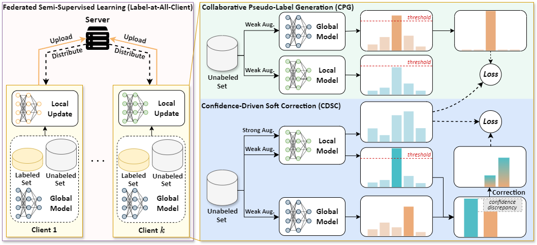 简介:联邦半监督学习(FSSL)旨在利用各客户端的未标注数据,在仅有有限标注数据的情况下,训练一个具备强泛化能力的全局模型,但数据异质性作为联邦学习的固有特性,显著降低了伪标签的质量。本文深入探讨了FSSL问题,并揭示:(1) 数据异质性加剧了伪标签的不匹配问题,进一步降低了模型性能并影响收敛性;(2) 随着异质性的增加,本地模型和全局模型的预测趋势逐渐偏离。基于上述发现,本文提出了一种简单而高效的方法SAGE,根据置信度差异灵活修正伪标签。这一策略有效缓解了由于错误伪标签导致的性能下降问题,并增强了本地模型与全局模型之间的一致性。实验结果表明,SAGE在性能和收敛性方面均优于现有的FSSL方法。