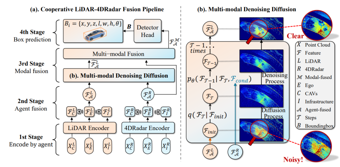 简介:当前多智能体协同感知系统在恶劣天气条件下性能显著下滑。4D 毫米波雷达可提供多普勒和额外的几何信息,本文提出了一种新颖的LiDAR-4D Radar融合目标检测框架,并提出4D Radar特征辅助的LiDAR去噪扩散模块(MDD)。此外,本文构建了V2X-R,首个包含激光雷达、相机和 4D 毫米波雷达的V2X仿真数据集。实验表明,本文的方法在 V2X-R 数据集上表现优异,且MDD 模块可有效提升模型在恶劣天候下的性能。数据集和代码已开源:https://github.com/ylwhxht/V2X-R