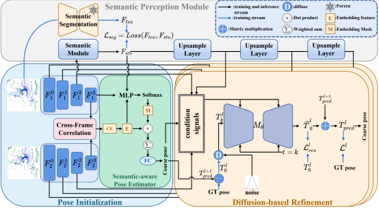 DiffLO:Semantic-Aware LiDAR Odometry with Diffusion-Based Refinement简介:LiDAR里程计方法在场景理解不足和噪声干扰的情况下容易出现不准确的位姿估计。针对这一挑战,本文提出了一种基于扩散优化的语义感知LiDAR里程计网络(DiffLO)。为应对动态、低纹理等复杂场景的影响,本文通过语义蒸馏方法,将语义信息融入里程计任务中,使网络更关注对位姿估计有益的物体。此外,本文提出了基于扩散的优化方法,利用与位姿相关的特征作为条件约束,通过生成多样性迭代优化位姿估计。在KITTI里程计数据集上的实验表明,该方法超过了近期所有基于学习的方法。该论文第一作者是厦门大学信息学院2023级硕士生黄泳树,通讯作者是王程教授。由刘晨、朱明航、敖晟助理教授、温程璐教授共同合作完成。