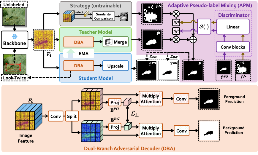 简介:无监督伪装目标检测因其无需依赖大量像素级标注而受到广泛关注。现有方法通常采用固定策略生成伪标签,并使用1x1卷积层作为简单解码器进行训练,导致其性能远低于全监督方法。现有方法存在两个主要缺陷:1) 固定策略构建的伪标签通常包含大量噪声,模型容易学习到错误的知识;2) 伪标签分辨率较低且前景与背景像素之间存在严重混淆,简单解码器难以有效捕捉和学习伪装目标的语义特征,尤其是在处理小尺度目标时表现较差。为了解决上述问题,本文提出了一个动态伪标签驱动的无监督伪装目标检测框架(UCOD-DPL)。该方法包括自适应伪标签融合模块(APM)、双分支对抗解码器(DBA)以及“二次观察”机制(Look-Twice Mechanism)。其中,APM模块自适应融合由固定策略和教师模型生成的伪标签,以防止模型过度拟合错误知识,同时保持自我纠正能力;DBA解码器通过对不同分割目标的对抗学习,引导模型克服伪装目标的前景-背景混淆问题;“二次观察”机制模拟人眼观察伪装目标时的缩放过程,对小尺度目标进行二次细化处理。实验结果表明,本文的方法表现优异,甚至超越了部分现有的全监督方法。