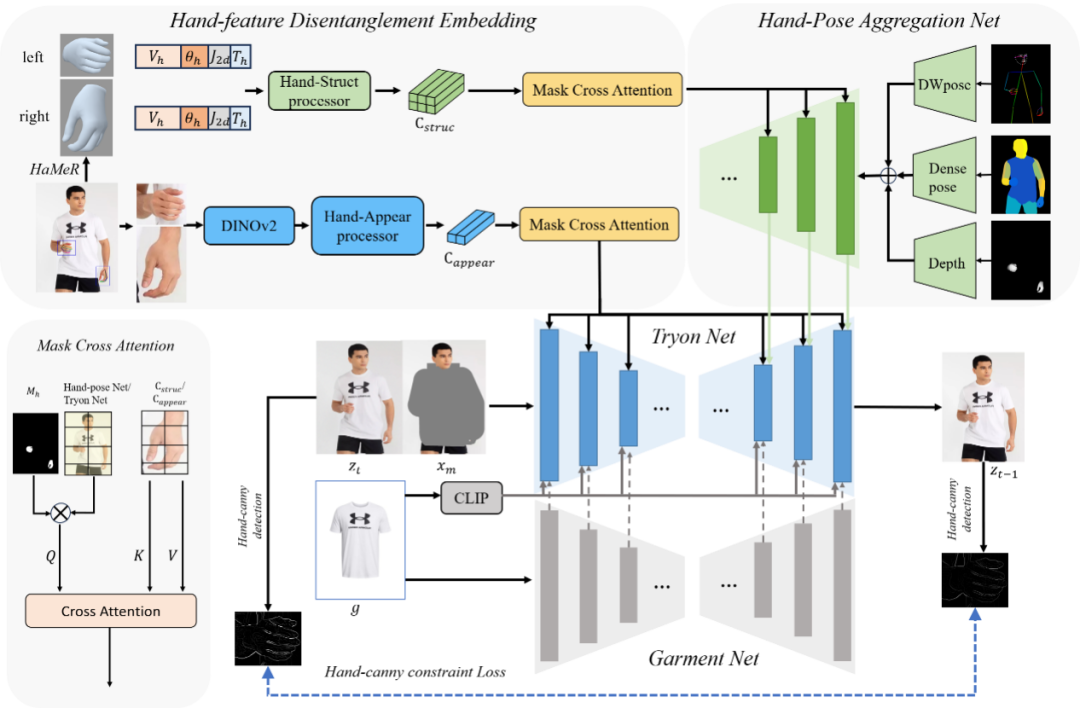 简介:该文提出一种基于手部先验增强的虚拟试衣方法VTON-HandFit,以解决扩散模型在手部遮挡场景下的服装失真问题。首先,基于ControlNet架构定制了手部姿势聚合网络,能够显式且自适应地编码全局手部及人体姿势先验。其次,为了充分挖掘手部相关结构与视觉信息,提出了手部特征解耦嵌入模块将手部先验解耦为手部结构参数特征和视觉外观特征,并设计了掩码交叉注意力机制实现特征解耦嵌入。最后,构建手部边缘约束损失,能够从原始模特图像的手部轮廓中更好地学习结构边缘信息。在公共数据集及自建Handfit-3K手部遮挡数据集进行的实验表明:该文提出的方法优于现有主流方法。