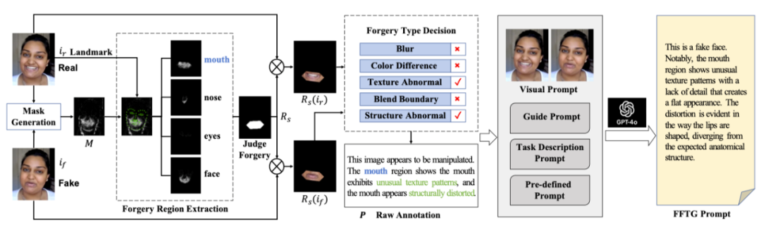 简介:本文针对面部伪造检测领域中文本注释的质量问题提出了创新性解决方案。随着面部伪造篡改技术的发展,现有的检测方法在泛化能力和可解释性方面面临挑战。本研究提出了一种新型注释方法 Face Forgery Text Generator (FFTG),通过利用伪造掩码进行初始区域和类型识别,结合全面的提示策略来减少多模态大型语言模型中的幻觉问题。FFTG生成的文本注释在识别伪造区域方面显著优于人工标注和直接的GPT标注,准确率提高了27%。基于这些高质量注释,通过微调CLIP和多模态LLM进行验证,实验结果表明本方法不仅能产生更准确的注释,还能提高模型在各种伪造检测基准上的性能。FFTG为多模态伪造检测提供了一种兼具泛化能力和可解释性的方法,为未来多模态取证任务的研究提供了全新的思路。