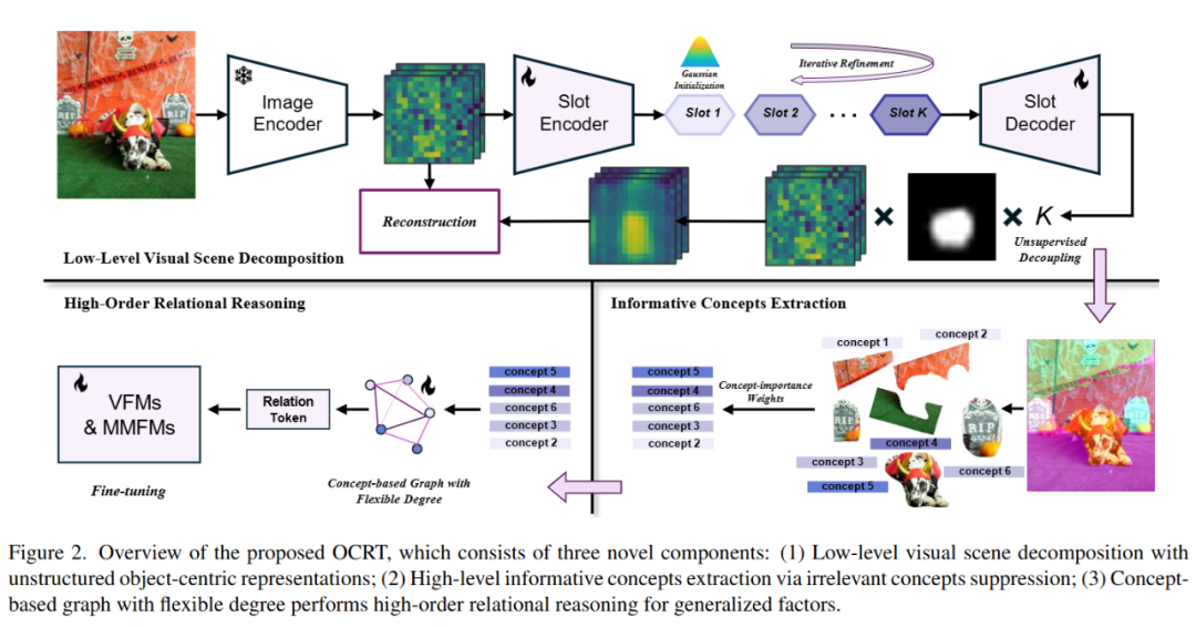 OCRT: Boosting Foundation Models in the Open World with Object-Concept-Relation Triad简介:尽管现有的基础模型(FMs)在多种下游任务中取得了显著进展,但在开放世界中面对分布偏移、弱监督或恶意攻击时,其泛化能力显著下降。与以往针对特定任务或模型的改进方法不同,本文从人类认知科学的角度出发,发现从密集的视觉输入中提取稀疏的高级概念和复杂的关系结构可以有效提升模型的泛化能力。基于此,本文提出了一种新颖的框架——目标-概念-关系三元组(OCRT)。OCRT通过无监督解耦和迭代优化,将视觉场景中的对象与一组以对象为中心的表示绑定,并将这些表示投影到模型易于解释的语义概念空间中,同时估计其重要性以过滤掉无关元素。进一步,OCRT构建了一个基于概念的图结构,用于提取高阶因子并促进这些概念之间的关系推理。为了验证OCRT的有效性,本文将其实用于两种代表性基础模型——SAM和CLIP,并分别命名为OCRT-SAM和OCRT-CLIP。广泛的实验表明,OCRT在多个下游任务上显著提升了SAM和CLIP的泛化能力和鲁棒性。该论文共同第一作者是厦门大学信息学院2022 级硕士生唐路垚和 2024 级博士生袁与炫,通讯作者是黄悦教授和陈超奇助理教授(深圳大学),由张坤教授(卡内基梅隆大学、默罕默德·本·扎耶德人工智能大学)共同合作完成。