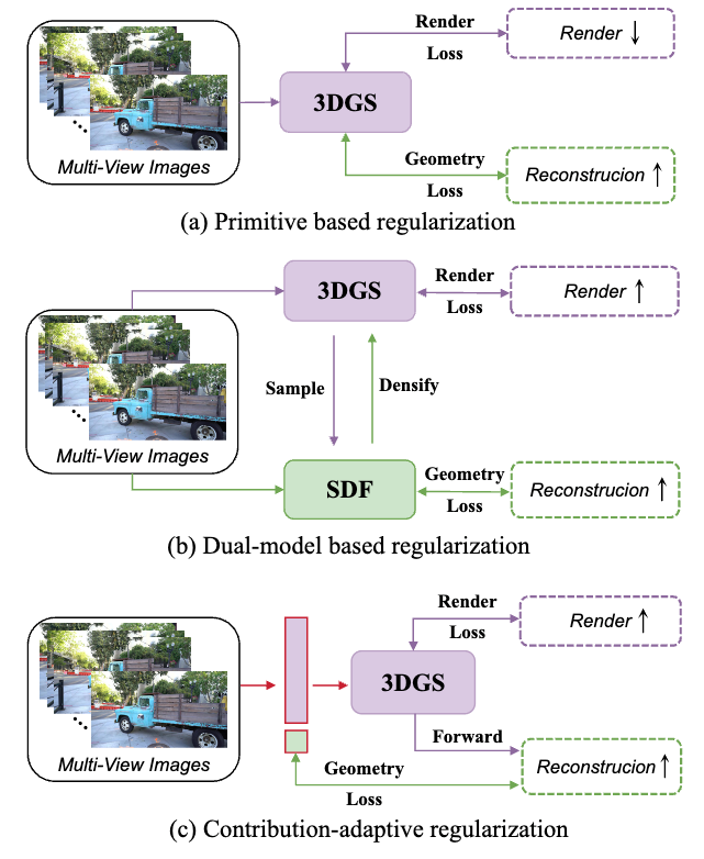 简介:本文提出了一种基于三维高斯泼溅 (3D Gaussian Splatting, 3DGS)的贡献自适应正则化的统一模型CarGS,用以实现同时进行的高质量渲染和表面重建。此外,本文还引入了一种几何引导的致密化策略,利用法线和符号距离场的线索进一步提升捕获高频细节的能力。本文的框架提升了渲染和几何重建两个任务的互助学习能力,同时其统一的结构无需像双模型方法那样使用单独的模型作用于不同任务,保证了高效性。广泛的实验表明,CarGS能够在保持实时速度和最小存储大小的同时,在渲染保真度和重建精度上实现SOTA的结果。