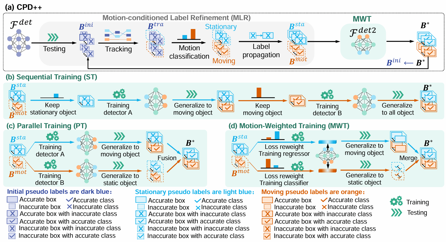 自主感知平台,如无人驾驶车辆、机器人,需要实时检测周围动态目标以实现自主避障与导航。基于全监督、半监督学习的目标检测方法高度依赖大量高质量人工标注。近年来实验室针对训练标注数据受限的难题,提出了系列弱/无监督学习点云目标检测方法(COIN, ICCV2023; HINTED, CVPR 2024; CPD, CVPR 2024; DOTA CVPR 2025; MOTAL ICCV 2025等)。其中,于2024年提出的常识原型约束下的无监督点云目标检测方法(CPD, CVPR 2024),可实现在大目标类型上的高性能无监督目标检测。在此基础上,本研究提出的CPD++进一步突破了室外开放场景小目标的无监督检测难题(如图1所示)。CPD++从静止目标中学习目标位置尺寸知识,从运动目标中学习类别知识,并通过迭代训练实现目标位置尺寸与类别知识的相互迁移,有效解决了无监督三维目标检测中标签匮乏与标签噪声大的问题。