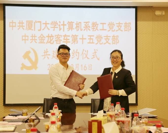 随后,曲延云教授主持了厦门大学计算机系教工党支部与金龙客车第十五党支部的共建签约仪式,对学院领导的关怀和支持表示感谢,与客车制造的龙头企业进行支部共建本身就是“双一流”建设:“一流高校+一流企业”。希望双方能增进了解,同时发挥高校理论研究优势和企业工程实践优势,实现强强联手,将人工智能赋能企业,让支部共建开花结果。中共金龙客车公司第十五党支部书记柯永瑞同志详细介绍共建活动方案和联络小组核心成员,建立创新的共建活动机制,强化“立足创新抓党建、抓好党建促发展”的理念,做到以共建促党建,以共建促了解,以共建促发展,互相交流学习,提升党建业务水平,提高党支部的战斗力和凝聚力。随后,两位同志作为此次签约仪式的双方代表共同签署共建协议,双方领导和党支部成员合影留念。
