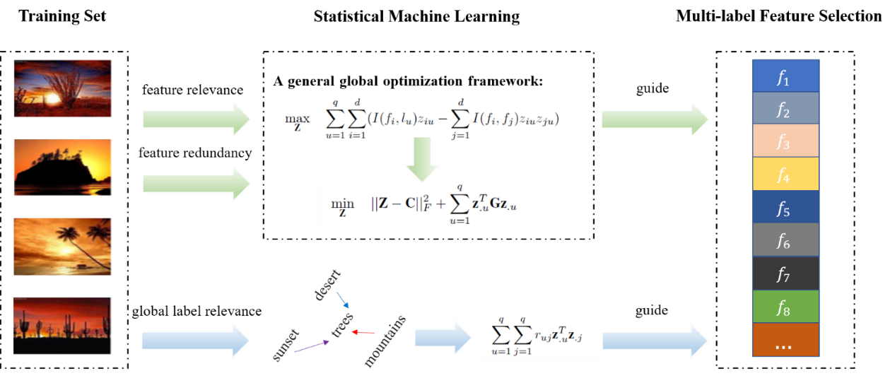 本文一作为厦门大学人工智能系2016级博士研究生张佳,通讯作者是其导师李绍滋教授。本文关注经典AI中的特征选择问题,提出了一种通用的全局优化框架来处理多标记数据中的维数灾难问题。具体地,我们考虑了特征和标记之间的相关性,特征之间的冗余性,以及标记之间的相关性来进行多标记特征选择。所提优化框架能够快速获取全局最优解。此外,所提优化框架具有很强的扩展性,能够轻松利用多标记数据的内在性质进行建模。如考虑标记具有的固有属性,我们扩展了所提基础模型进行Label-specific Feature Selection。在20个标准多标记数据集上的实验结果显示:所提算法不仅学习性能远超相关算法,而且具有很高的计算效率。