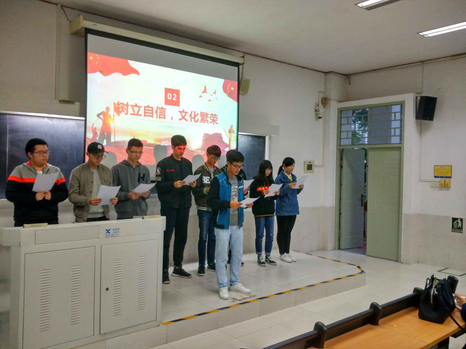 17级一班和三班设置了走进新时代的知识抢答环节,用答题的形式来检验理论学习的成果。17级二班让人眼前一亮,他们用模拟人民代表大会的形式让人大代表提出关乎国计民生的提案,在游戏中体现中国政治制度的优越性。17级四班则在团课中组织观看了红色电影,来介绍党的辉煌历史,在历史的云烟中追随着党的足迹。