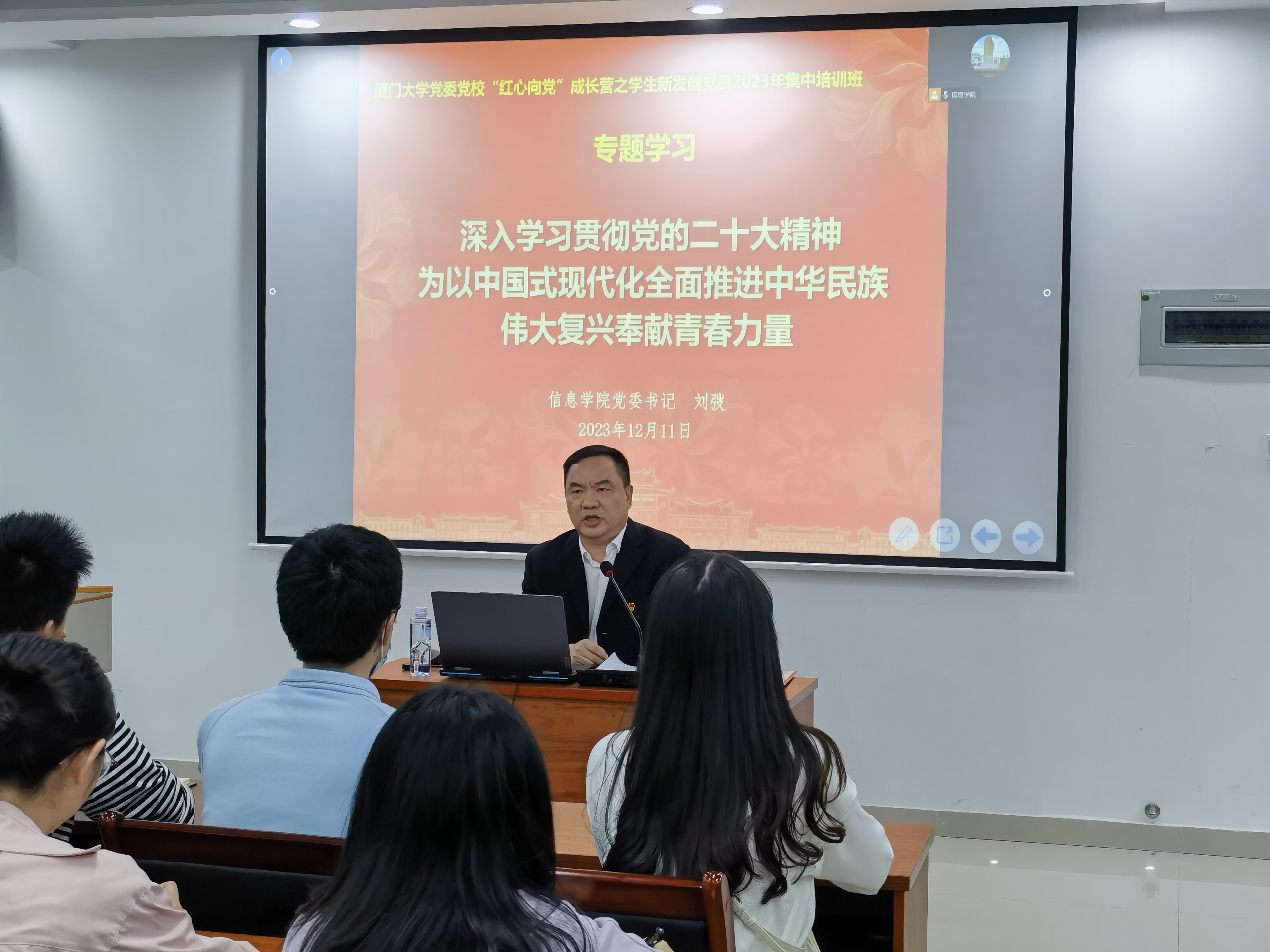 此次专题学习是厦门大学党委党校“红心向党”成长营之学生新发展党员2023年集中培训班的内容之一,新发展党员培训是党员发展的必要环节和不可缺失的过程主题学习会旨在通过深入学习党的二十大精神,推动新党员能够自觉加强党性修养和锻炼,不断提高自身素质和能力水平,将习近平新时代中国特色社会主义思想内化于心,外化于行。信息学院全体学生新发展党员、辅导员共计120余人参会。