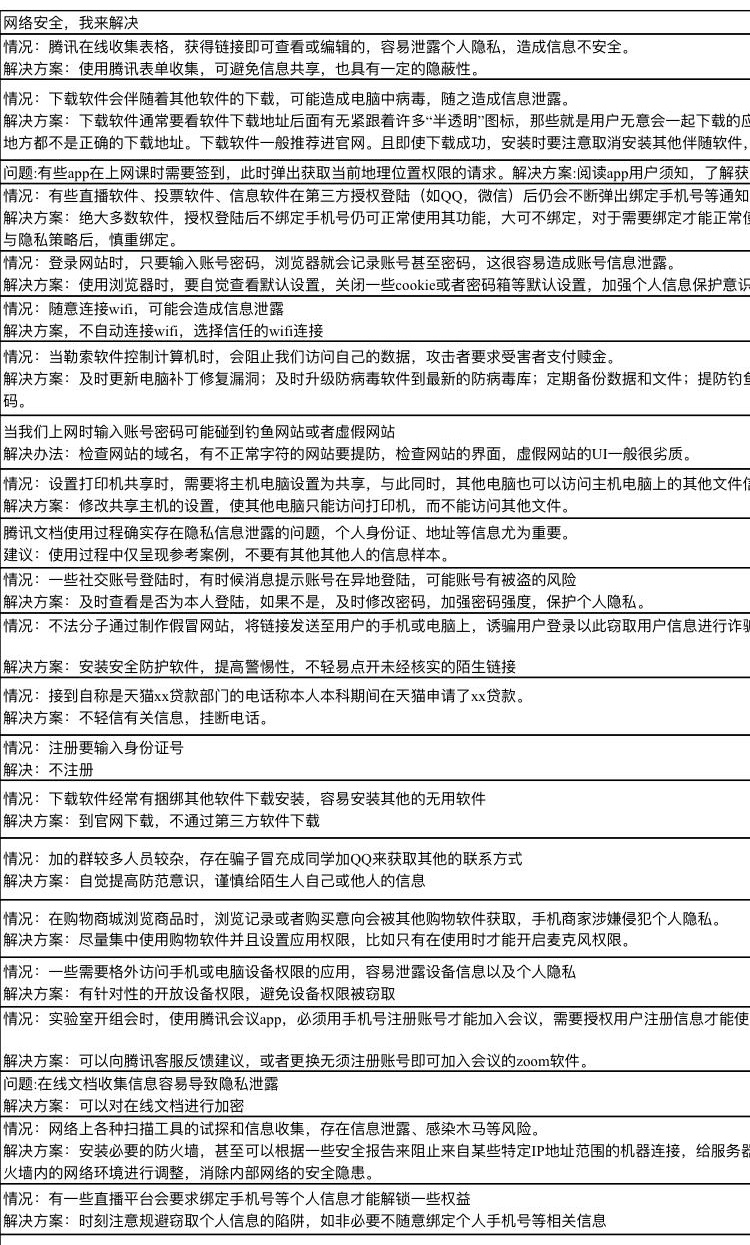 支部的第三个活动是开展“网络安全,我来解决”的信息收集活动,本活动号召支部党员发挥先锋模范带头作用,针对在疫情期间的线上打卡,线上学习,线上收集信息等生活和学习过程中遇到的信息泄露安全问题,尝试提出自己的解决方案,再由支部委员进行整理和制作,形成信息安全提示本,发放给广大师生,帮助大家提高警惕,解决信息安全问题。本次活动共收集到支部党员上交的方案30份,涉及学习软件、信息收集、网课网址登陆等各类信息安全问题,目前支部委员正在耐心整理、精心制作宣传提示本。