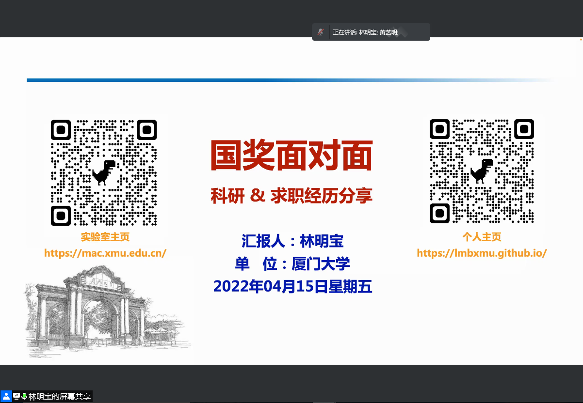 为进一步加强学院学风建设,充分发挥榜样引领作用,弘扬青春正能量,4月15日晚上,信息学院以线上方式举办“‘信息·画旗帜’研究生国奖面对面分享会”。本期分享会邀请到来自人工智能系的2018级优秀博士研究生林明宝与同学们分享自己科研学习、实习实践等方面的经验与感悟。学院团委副书记黄艺明老师出席本次分享会,近300名研究生参加本场分享会。会议由2021级硕士研究生张辰元同学主持。