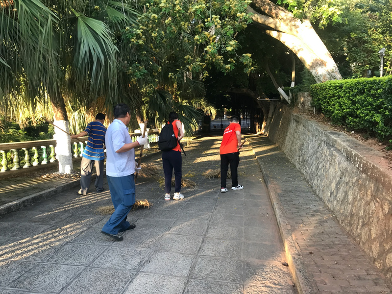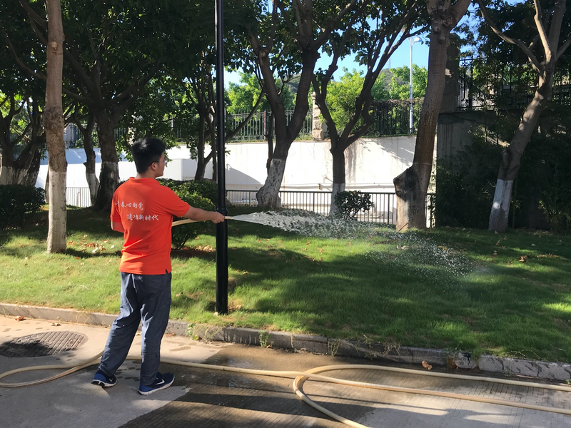 保洁绿化工作方面,信息学院实践队队员们走进了厦门大学后勤集团的道路保洁、绿化养护两个工作岗位。早晨5时30分,实践队员们与保洁人员一同上班进行道路保洁,清扫地上堆积的落叶。两天时间里清扫了嘉庚广场和鲁迅广场附近的多条街道。炎炎夏日,汗水很快就打湿了学校保洁工作人员和队员们的衣衫,实践队员们真实地体会到了保洁人员的辛苦。队员回忆道:“当我们上早课的时候,的确从未注意过路上的落叶,原来是保洁人员天还没亮就开始做清扫。”
