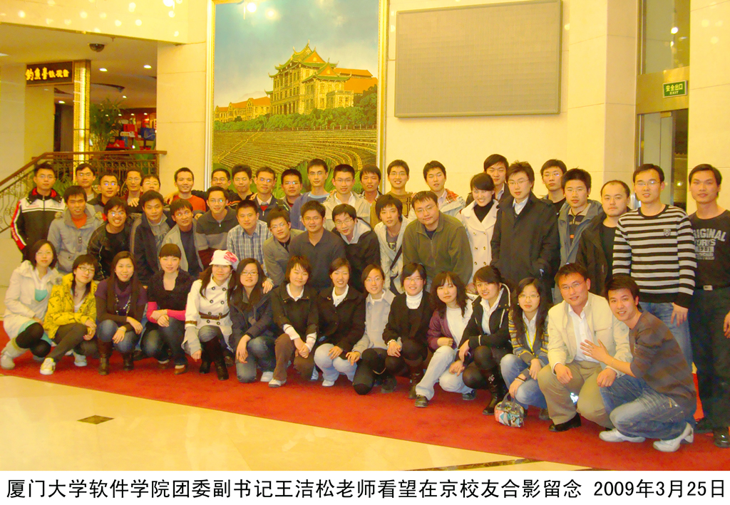 2009年3月25日晚,软件学院团委副书记王洁松老师代表学院在北京市厦门商务会馆亲切看望了北京校友,并与校友们聚会座谈,近50名在京校友参加了此次活动,整个活动在温馨轻松的氛围中进行。