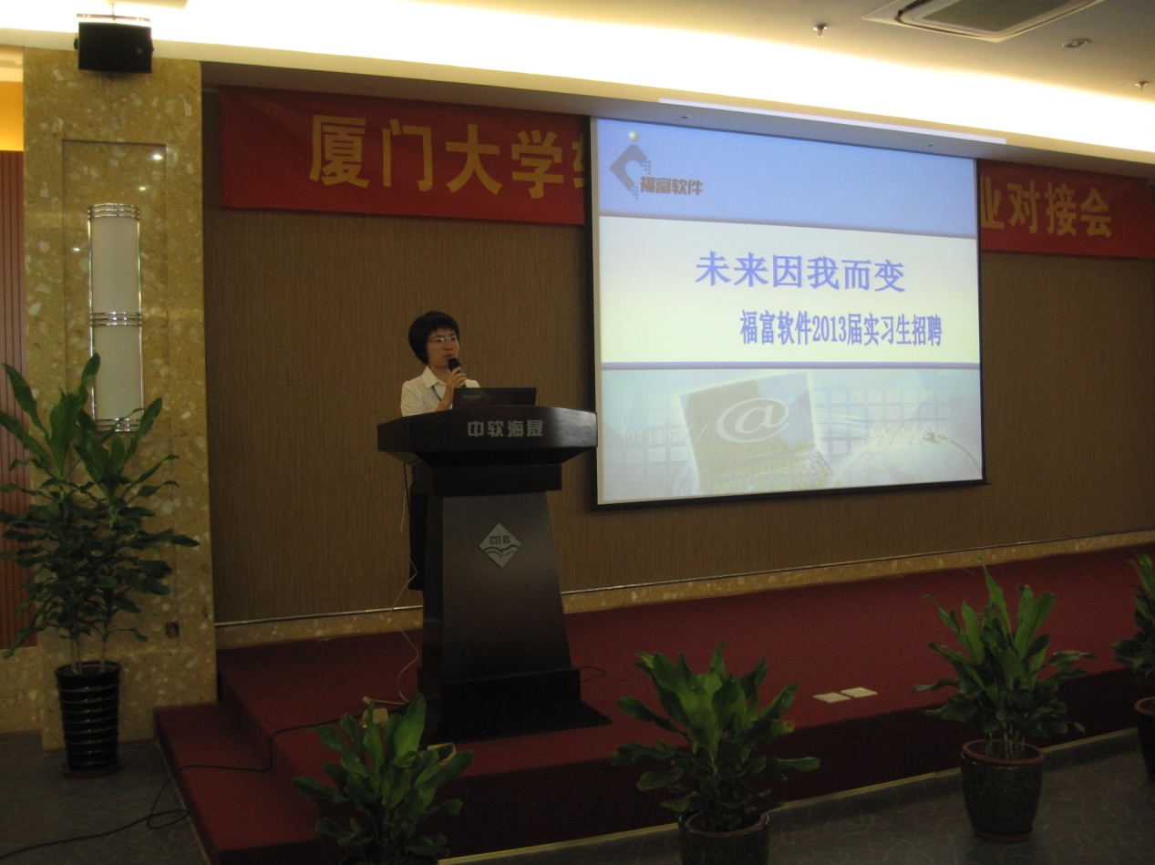 2012年7月5日下午13:00,厦门大学软件学院实训班企业对接会在厦门中软海晟公司一楼报告厅如期举行。此次对接会的目的是为企业与厦门大学软件学院学生搭建良好的沟通平台。参与此次对接会的公司有福建富士通信息软件有限公司简称福富软件公司、新大陆科技集团公司、厦门铃盛软件有限公司、南京中兴软创科技股份有限公司。