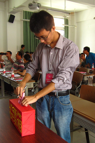 会议在庄严的国歌声中开始。首先由学生会主席丁苗对软件学院上一年度的各项工作做了详实报告,一同回顾并总结了所取得的各项成绩和不足。在审议通过了厦门大学软件学院第一次学生代表大会选举办法草案及监票人、计票人建议名单后,16位候选人轮番上台发表竞选演说。他们或激情洋溢,或幽默风趣,或以情动人,但都表达出自己为老师同学服务的热情和敢想敢为的干劲。经过代表们慎重的投票和计票人认真的计算后,刘梦、张璐、陈力琪、孙淼、陈智凯、陈新6位候选人当选为新一届学生委员会委员。
