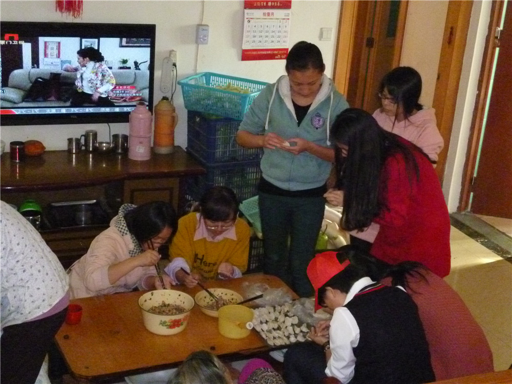 来自艺术学院的志愿者给爷爷奶奶们表演了《苏武牧羊》《东方红》《夕阳红》《一杯美酒》等经典红色老歌,富有层次感的四重唱引起了老人们极大的共鸣,老人们微笑着跟着哼唱并随节奏拍手,有些奶奶回忆往事感动得热泪盈眶,并给我们唱了《送别》,志愿者们禁不住拍手叫好。紧接着,志愿者又上演了精彩的街舞,一个个酷炫的动作让老人家们也跟着摇摆起来;当我们邀请一个白发苍苍的奶奶到客厅来观赏节目时,奶奶很抱歉地说自己腿脚不灵便,于是热情的志愿者特地来到奶奶的房间,给奶奶吹了葫芦丝并唱了《爱拼才会赢》和长征组歌的部分曲目,得到老奶奶的练练称赞;一个曾在厦门某中学担任体育老师的爷爷告诉我们,他年轻时候非常热爱运动,曾是公社的篮球队的主力前锋,现在依然很喜欢看NBA并和志愿者兴奋地谈论起了林书豪,持乐观向上的心态让志愿者们心生佩服。 另一边,负责包饺子的志愿者也忙活开了,剁陷,擀皮,包饺子,煮饺子,有模有样、有条不紊地进行着,爷爷奶奶们乐得合不拢嘴,也积极参与到包饺子队伍之中。经过一个下午的辛苦劳动,志愿者端出了香气四溢的饺子,饱含爱心热气腾腾的饺子也温暖了老人的心。