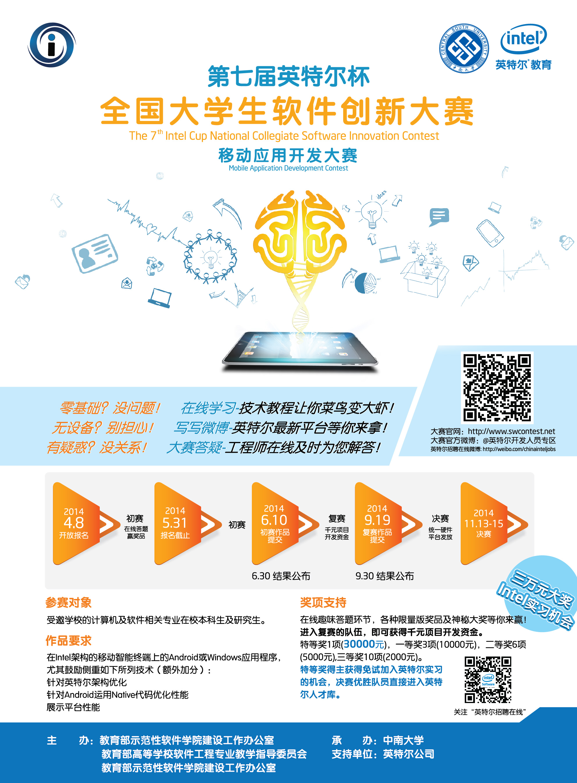由全国大学生软件创新大赛组织委员会和教育部高等学校软件工程专业教学指导委员会主办,中南大学承办,英特尔公司提供支持的第七届“英特尔杯”全国大学生软件创新大赛即将开赛,本届比赛将邀请中国工程院院士张尧学担任顾问。