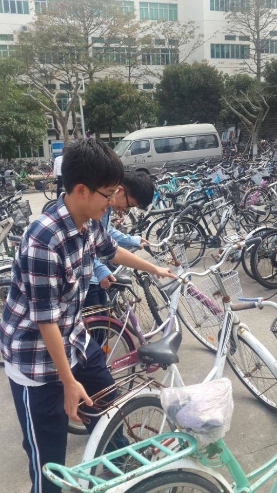 不时有同学经过,露出了先是诧异,后是欣然的神色。然而投入的同学们完全不受路人的干扰,我们可以看到,这边,一人扶住车头,一人托着车尾,齐心协力,小心翼翼地将自行车码的整整齐齐,再看那儿,一群女生微倾着头,专注地搜寻着宣传栏上的过时广告和海报,仔细地刮着顽固的粘痕......