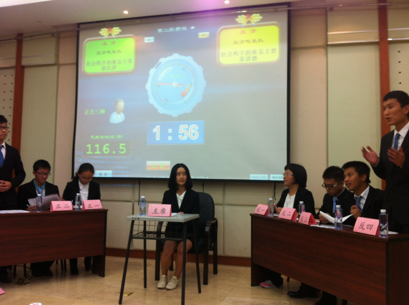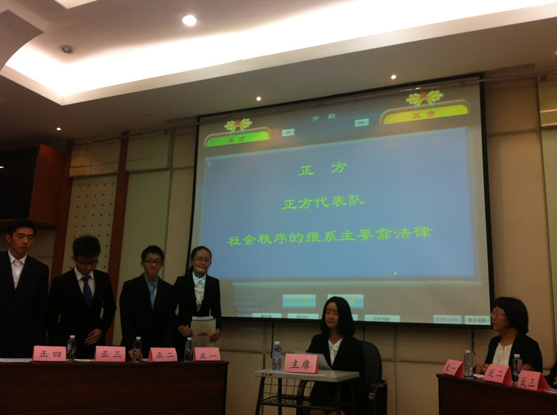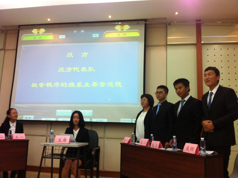 此次辩论赛的辩题是“社会秩序的维护需依靠法律还是道德”,正方持法律观点,反方以道德为立。比赛开始,双方就各自观点开篇论理。正方以社会秩序需依靠法律维护为中心,强调法律的强制性及约束力。反方不落下风,以道德的灵活性及广泛性陈述靠道德维护社会秩序的重要性。紧接着,质询环节的辩论拉响了“舌战”号角,正反双方依次提问,你来我往,气氛激烈。随后,在自由辩论时间,双方立足各自意见,针锋相对,剑拔弩张,从身边赡养老人、酒驾之事入手,追溯古代儒法思想,科举为官之类,舌枪唇战的辩论让场下的评委和观众拍案叫绝。最后,双方总结陈词,再次重申各自的观点立场。