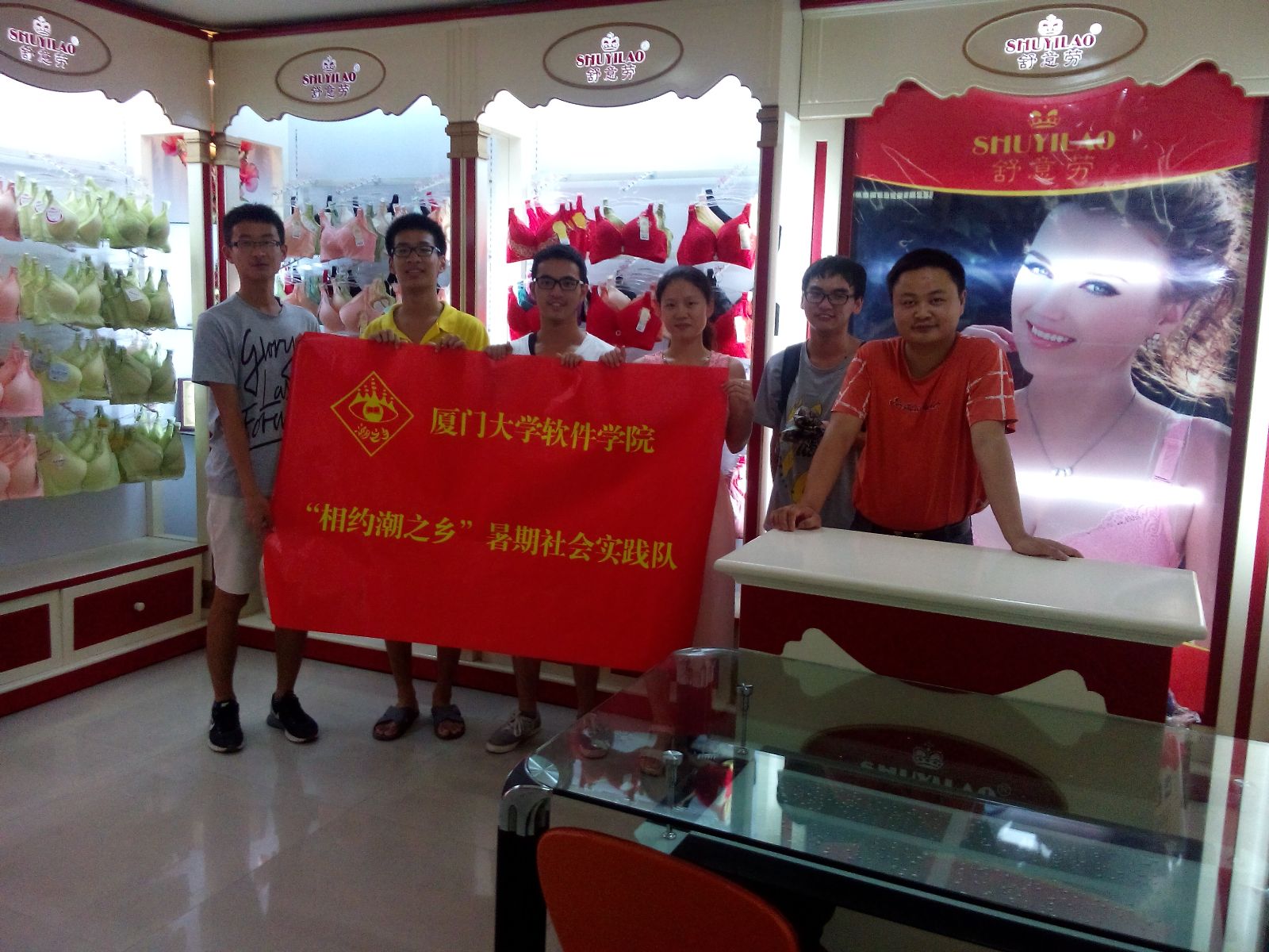 历经三个半小时的车程,实践队于下午两点到达潮南区陈店镇。虽然一路上颠簸疲倦,但队员们顾不得休息,一下车就马上前往汕头市黛安芬服饰实业有限公司的工厂及销售区开展调查。