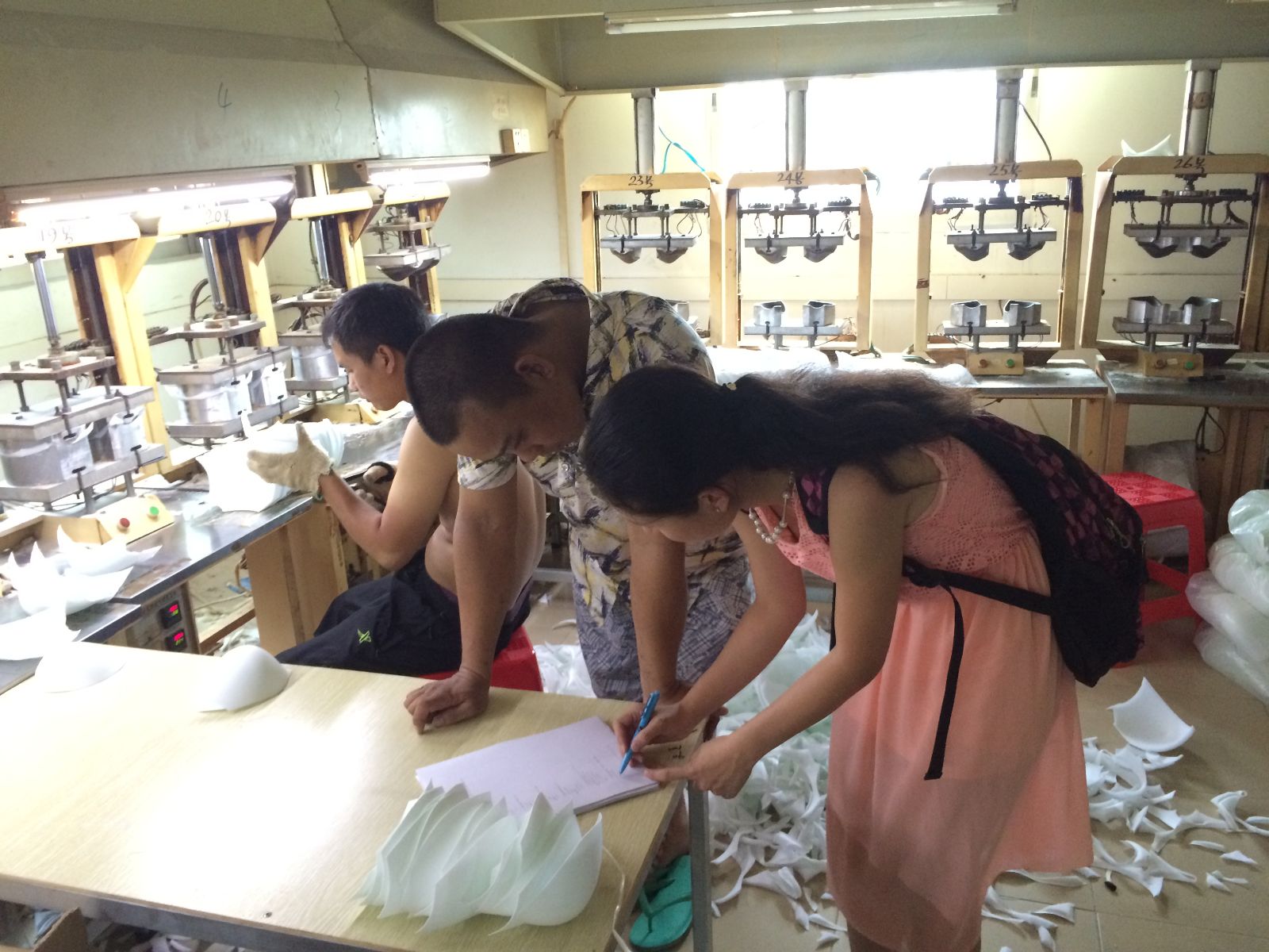 由于提前联系了黛安芬公司的老板,队员们得到了热情招待,并且能够顺利进入车间发放问卷、现场采访。车间温度很高,工人们大多光着膀子奋力工作,这让在场所有队员们深有感触。除了车间温度高外,发放问卷的过程也受到了其他阻碍:有些工人过早辍学。因此,队员们需要耐心认真地给工人们读问卷内容,但这丝毫阻止不了队员们想要了解工人们真实想法的决心。