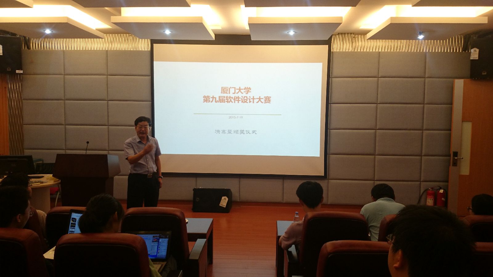 2015年7月19日,第九届厦门大学“软件设计大赛”决赛在科研楼鉴赏厅圆满落幕。本届“软件设计大赛”是由厦门大学教务处、共青团厦门大学委员会、厦门大学软件学院主办,共青团厦门大学软件学院委员会、厦门大学软件学社承办。我们有幸请到了赖永炫副教授、邱明助理教授以及王晓黎助理教授作为终审评委;并荣幸请到了院长王备战老师、学院党委副书记史亮老师以及辅导员李绍玉老师为“软件设计大赛”决赛开场致辞。
