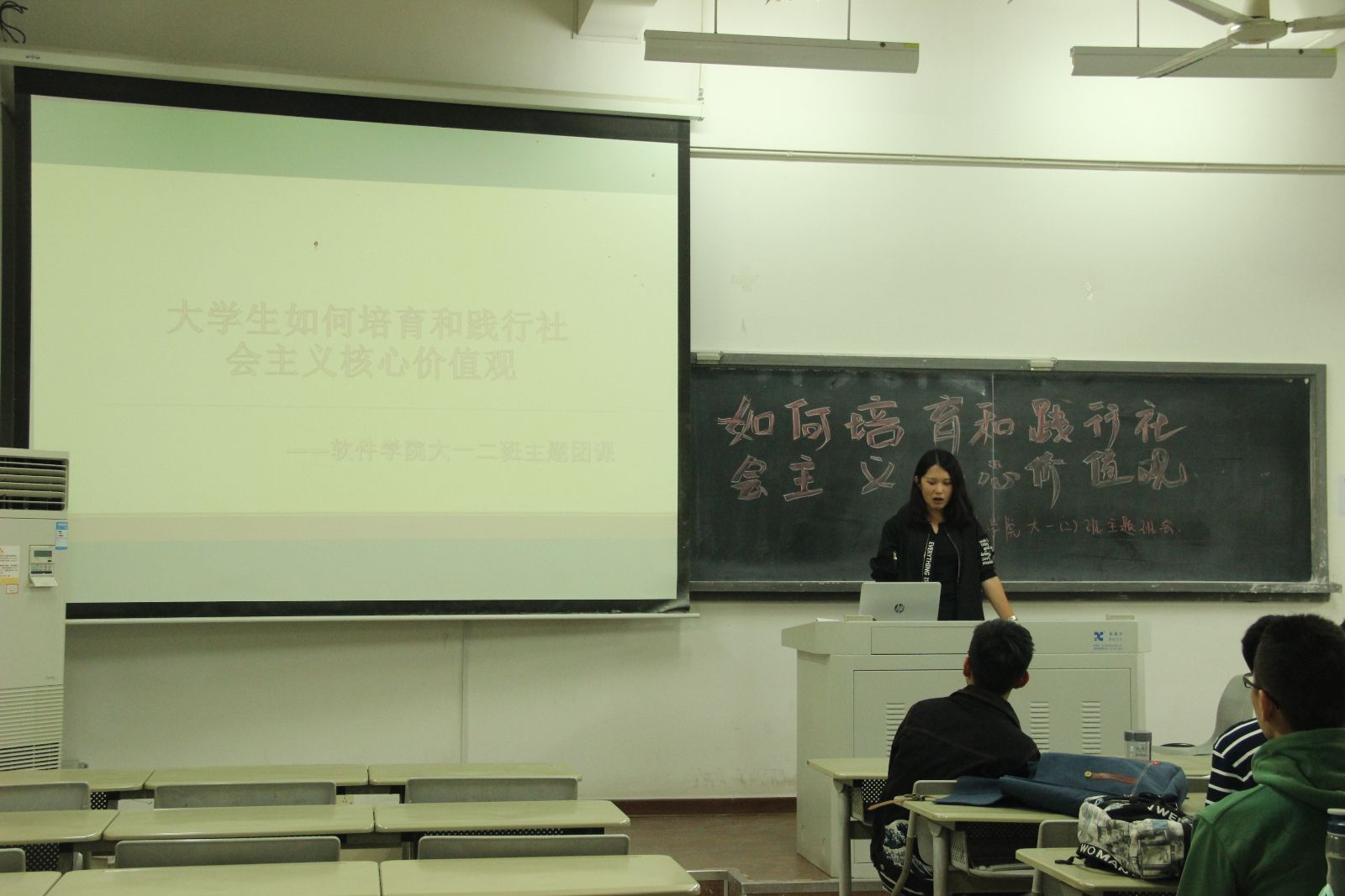 在团课的尾声,团支书再次回归主题,强调同学们一定要做社会主义核心价值观的积极践行者,应该承担应有的历史使命和社会责任感,积极地参与祖国的各种精神文明建设。