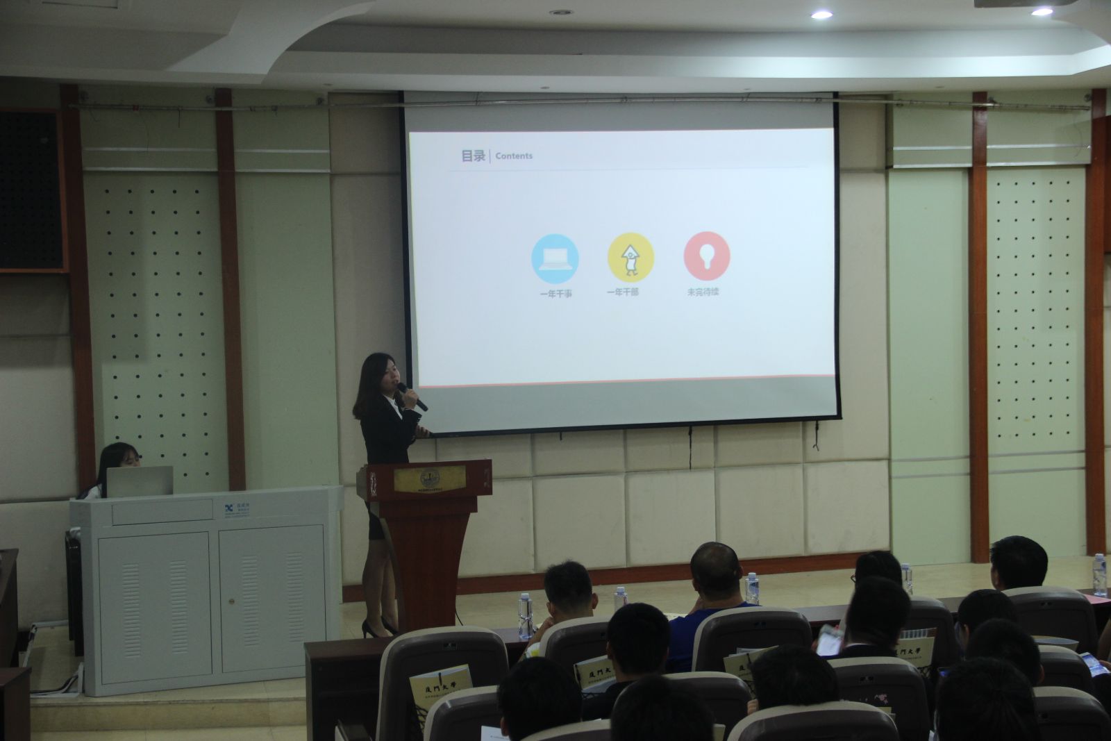 学生代表大会在庄严的国歌声中拉开帷幕。学生会副主席王铮镝宣读厦门大学校学生会委员会致贺信。随后学生会主席赵一阳、团总支书记周逸云先后上台就过去一年的工作做了总结报告。赵一阳提到过去的一年学生会在制度建设、活动开展和成果等方面的情况,并对自己的工作和经验进行了分享;周逸云围绕个人建设与组织建设开展述职,着重分享了自己对团总支的情感。