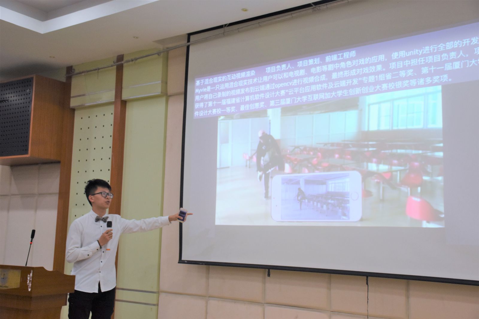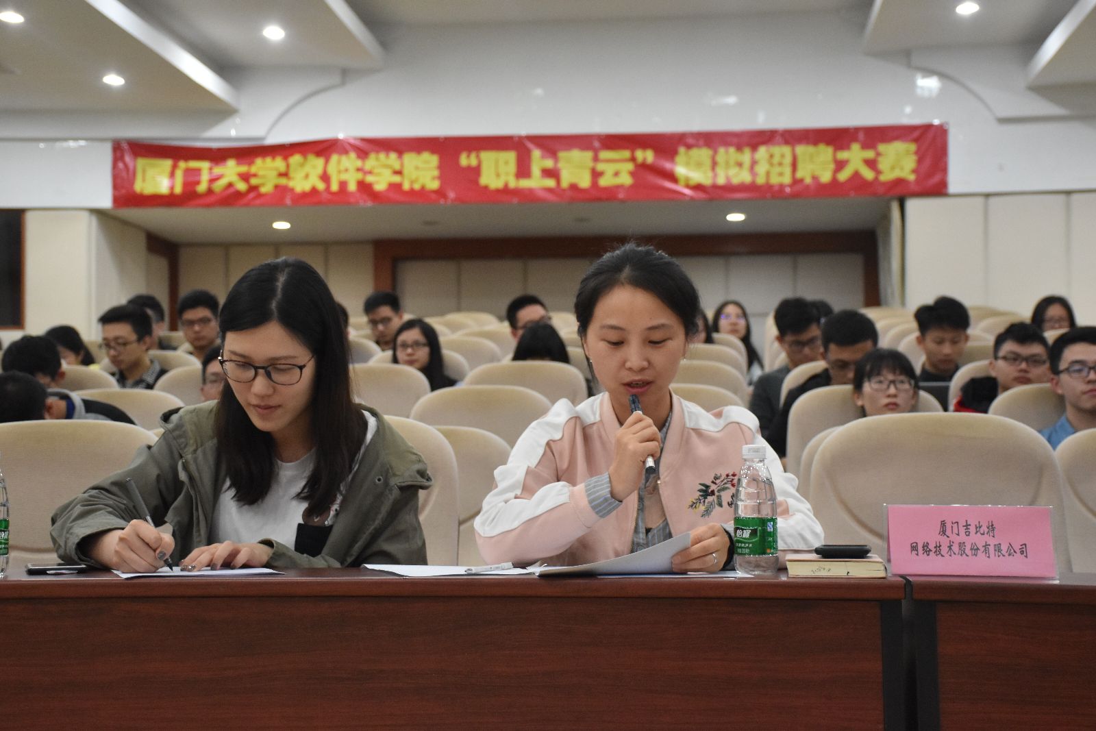 此次模拟招聘大赛邀请了美团点评、吉比特、厦门铃盛软件和美柚四家企业全程担任评委的工作。比赛吸引了40多名来自不同学院的同学报名参赛。整个比赛模拟企业招聘的真实流程,给选手们身临其境的感觉。同学们经过企业的简历筛选、笔试、面试,最终6位选手晋级总决赛。总决赛共包含“职场本色”、“职场亮剑”、“选手抢答”、“开黑环节”四个部分。在“职场本色”和“职场亮剑”环节中,6位选手都就自己的个人经历、项目经验进行了精彩的展示,并从企业设置的问题中抽取一道进行回答。在每一位选手展示和回答问题之后,现场企业评委对他们的表现进行详细的点评,并且给出相应的建议。