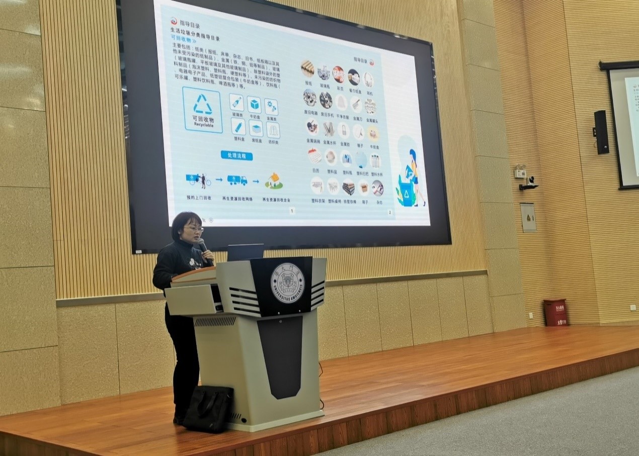 接着,蔡胜男老师引出“垃圾分类,人人有责”的主题,向同学们强调了垃圾分类的重要性和必要性,并以自己的经历鼓励同学们积极践行垃圾分类的理念;随后她又细致地向同学们介绍了垃圾分类的具体执行流程,列出相应的实物,耐心地教导同学们垃圾应当如何分类。