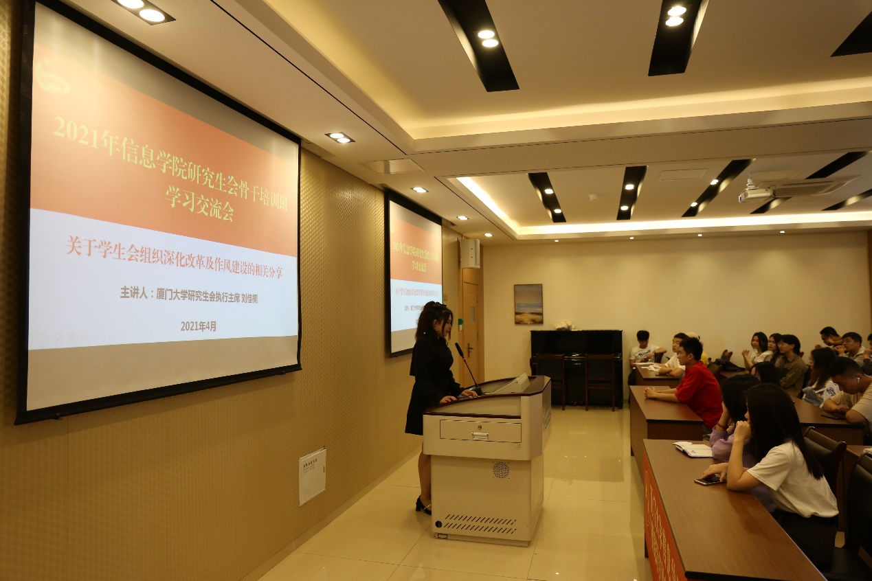 2021年4月22日信息学院于海韵行政楼C505举办了研究生会骨干培训班学习交流会,交流主题为关于学生会组织深化改革及作风建设。厦门大学研究生会执行主席刘佳桐、发展部负责人曹伟楠受邀参加了本次交流会并做相关分享。