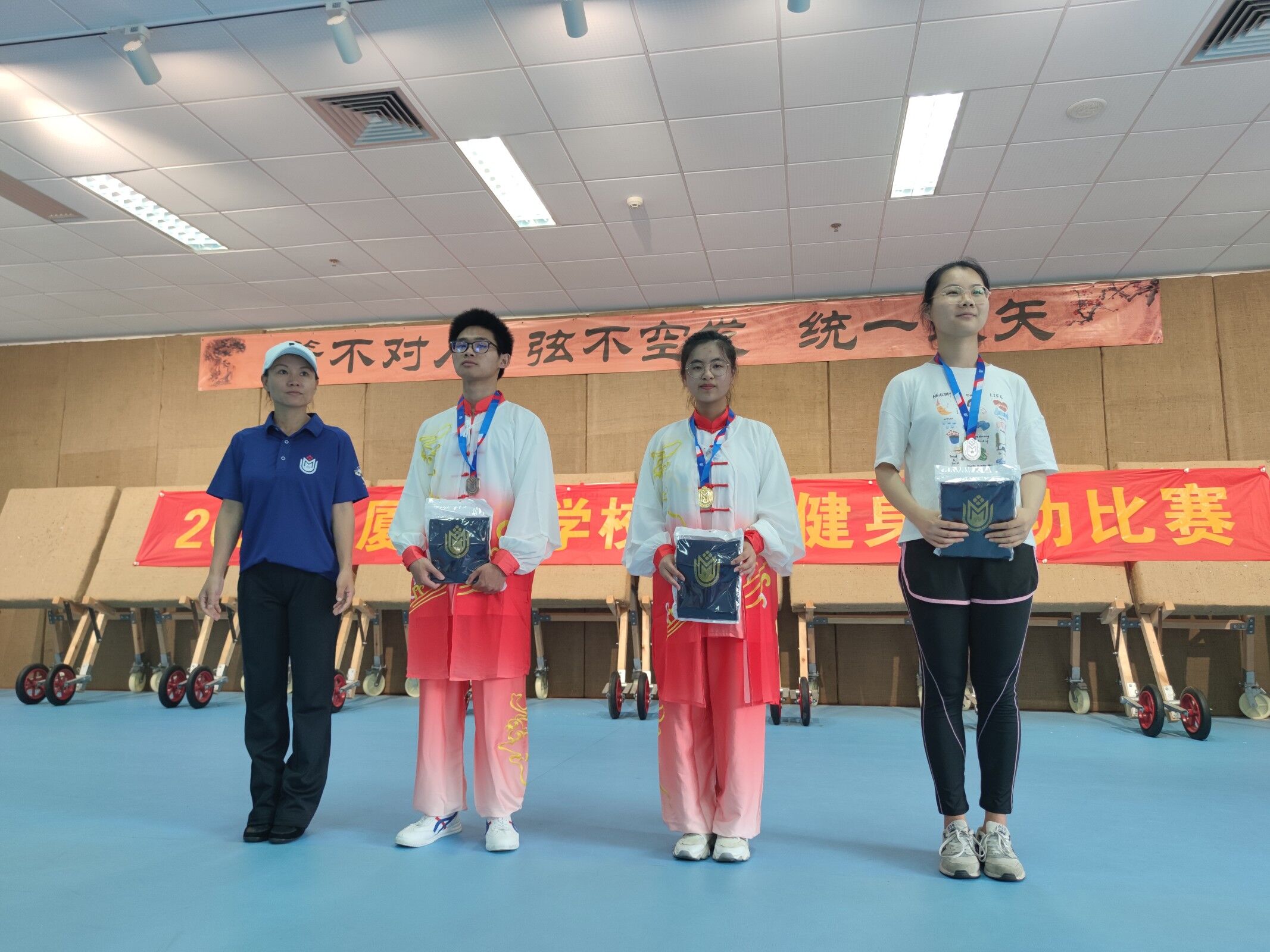 最终,我院代表队凭借优异的表现夺得翔安校区健身气功比赛团体总分第一名。林鲁翼同学代表学院上台领奖。