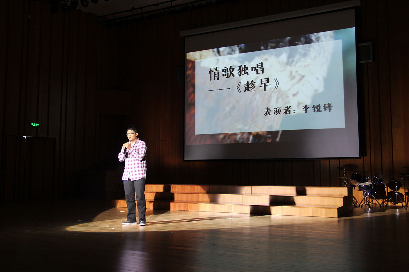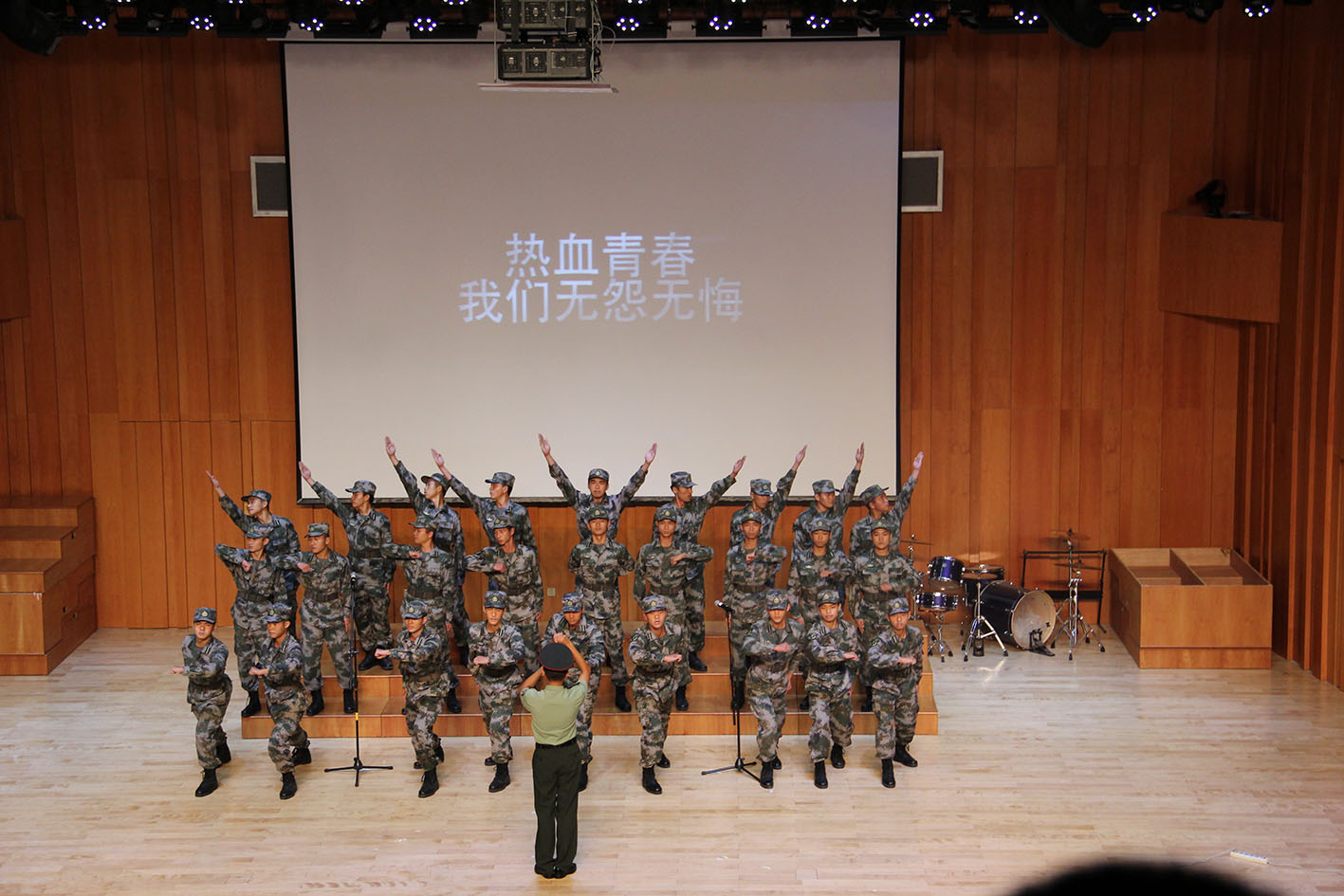 歌曲类节目中,不得不提的是由信息学院通信工程系2014级国防生带来的《当那一天来临》。他们的演唱铿锵有力,气势轩昂,不仅是歌声感染了在场的观众,他们身为国防生“生为国防,为国防而生”的坚定信念也让台下的掌声久久不息。