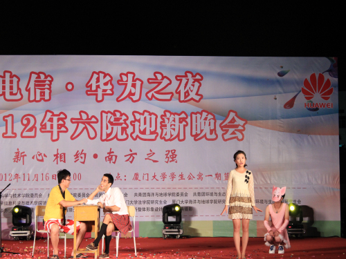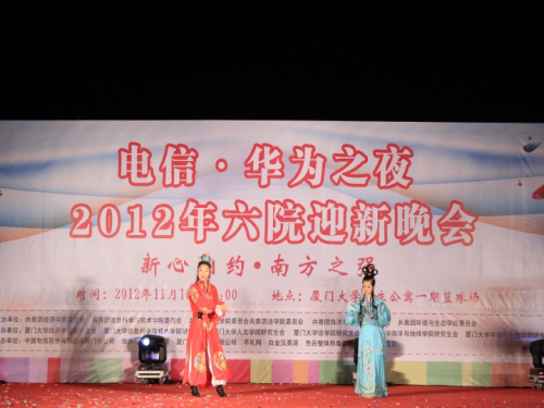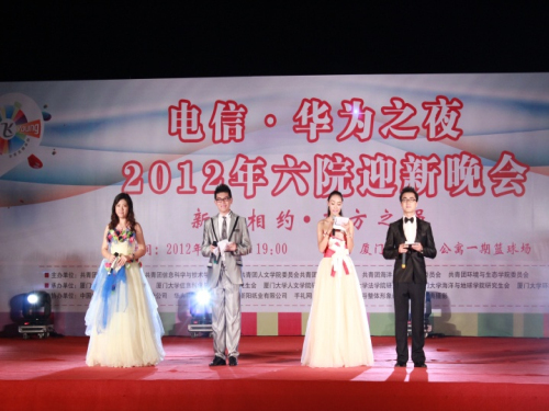 2012年11月17日晚,厦门大学2012年六院迎新晚会在海韵学生公寓一期篮球场隆重举行。此次六院迎新晚会由共青团经济学院委员会、共青团信息科学与技术学院委员会、共青团人文学院委员会、共青团法学院委员会、共青团海洋与地球学院委员会、共青团环境与生态学院委员会主办,各学院研究生会承办,。法学院党委书记侯利标、经济学院党委副书记孙梓光、信息科学与技术学院党委副书记刘元庆、人文学院党委副书记邱旺土、法学院党委副书记何丽新、各学院团委书记副书记、辅导员、以及中国电信、华为技术有限公司、厦门新阳纸业等七家赞助商代表出席了本场晚会。