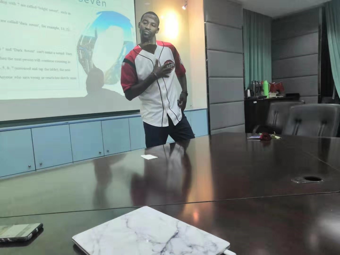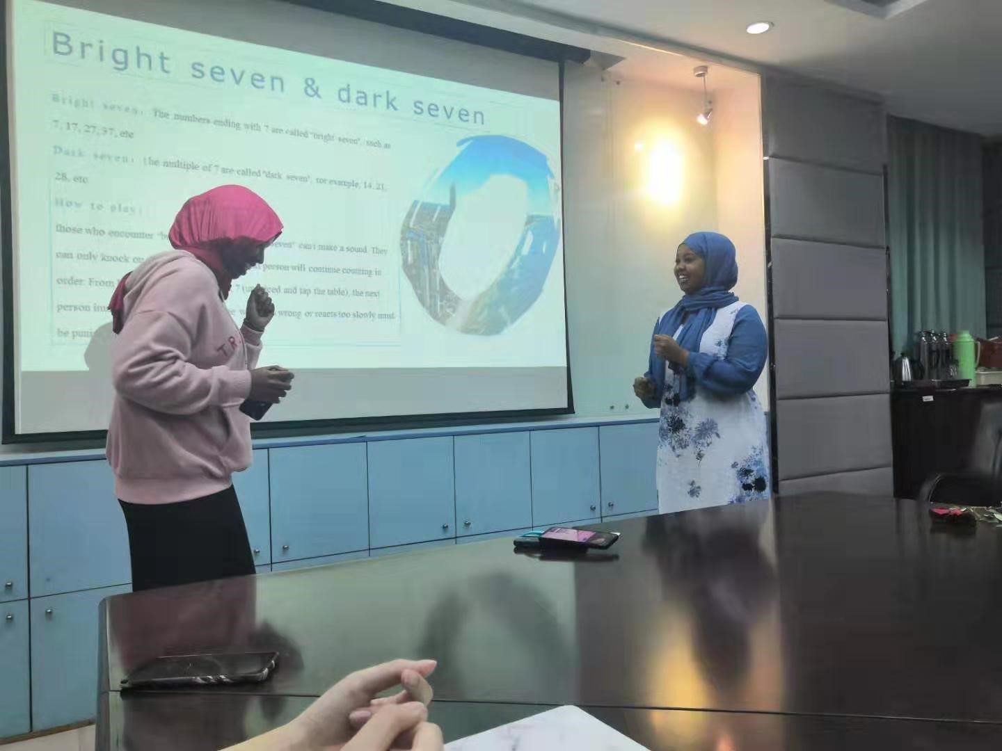 之后,海外部的部员们为海外生准备了一个数字游戏——明七暗七。海外部成员一一讲解游戏规则,每个人都听得很认真。游戏过程中,每个人都非常的专注,并积极参与其中。同时,没有回答正确的人,正是节目的表演者。来自坦桑尼亚的Auwal给大家讲了笑话,逗得满场欢声笑语,来自埃塞俄比亚的Halefom与索马里的Aska带来了热情的舞蹈,让大家感受到浓烈的民族气息,还有肯尼亚的Naph的单人舞蹈秀,同样精彩绝伦。他们的表演得到了大家热烈的掌声。因为他们的可爱与激情,迎新会达到了高潮。