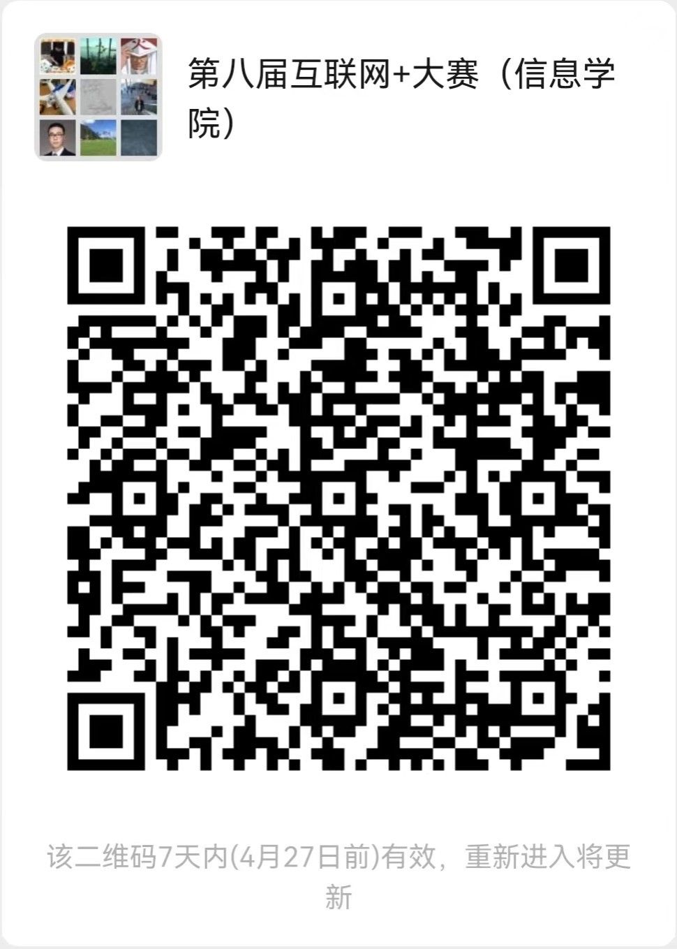 请有意向的参赛团队于4月30日前完成项目报名信息汇总表(https://docs.qq.com/form/page/DS2tGQ2VkdUJoRHVC)填写,并按“五、赛程安排(一)参赛报名”要求完成参赛报名且向校赛工作组邮箱提交参赛材料,同时加入“第八届互联网+大赛(信息学院)”微信群。