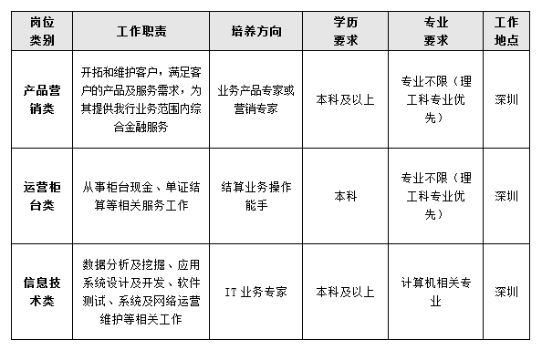 秉承“文化育人、事业留人、制度选人”的理念,深圳分行一直为广大青年学生的发展成长创造良好环境,为招行系统培养了一大批优秀的管理骨干和业务骨干。为加强员工队伍建设,为深圳分行可持续发展提供充足的人才资源,现面向全国高校招聘2017届全日制普通高等院校毕业生和海外归国留学生,具体如下:
