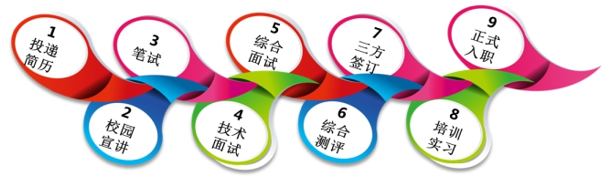 校园招聘流程:投递简历—校园宣讲—参加笔试—进行面试—签订三方协议—实习。
