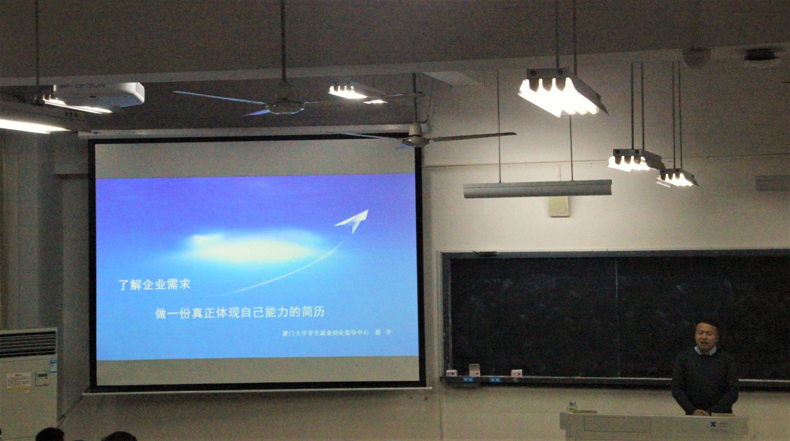 蔡宇老师首先通过数据向同学们展示了95后高校毕业生的毕业去向,分析了当前的就业形势。之后,他从简历的内容和版式等方面,让同学们了解如何撰写一份具有针对性的简历。蔡老师从实例分析,强调要认识自己,明确求职目的,了解目标企业及职业需求情况,突出自己的特色,针对职位撰写简历。不仅如此,蔡老师还多次从HR的角度,讲解了面试的技巧和需要注意的点。场上气氛活跃,同学们全神贯注,并不时记录下关键信息。