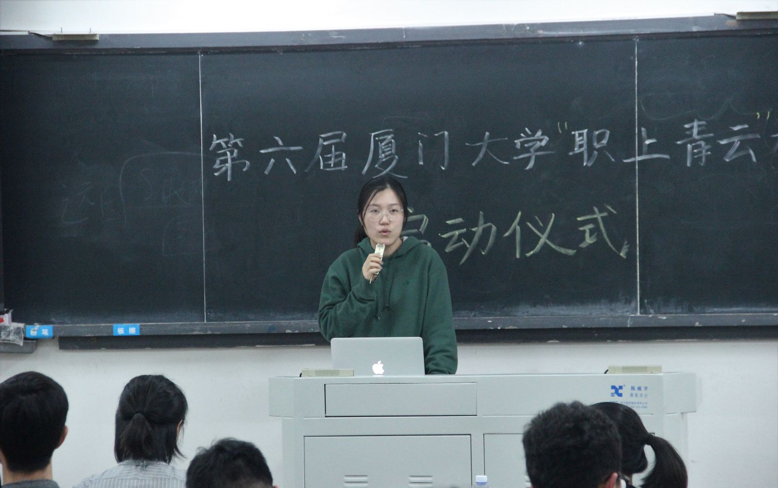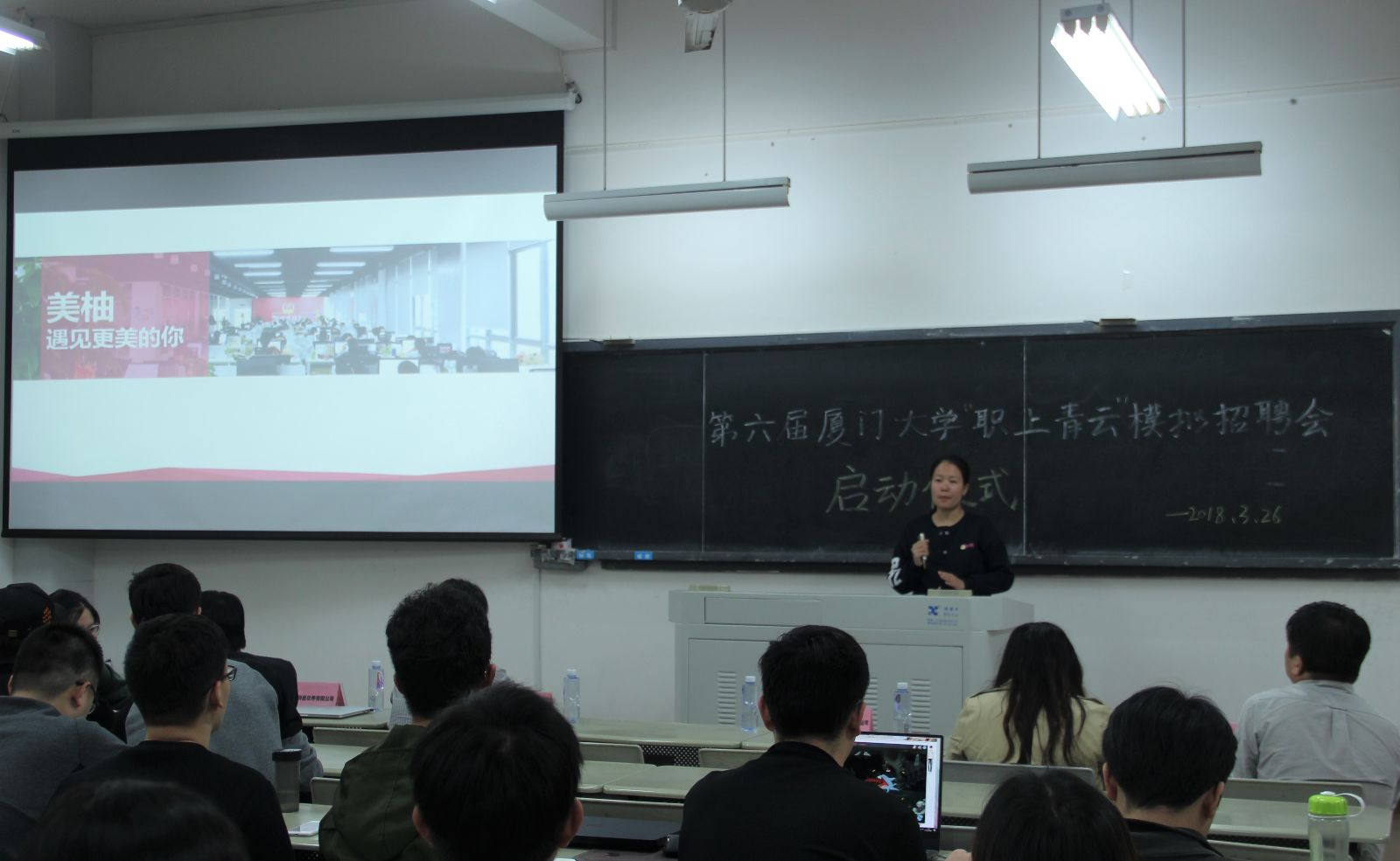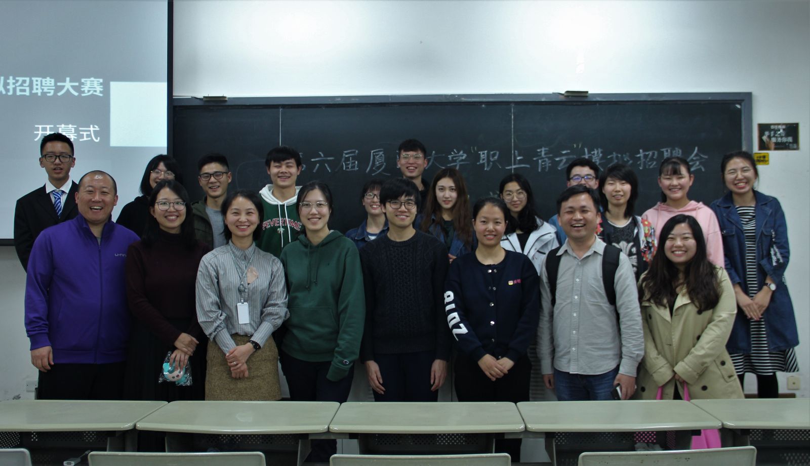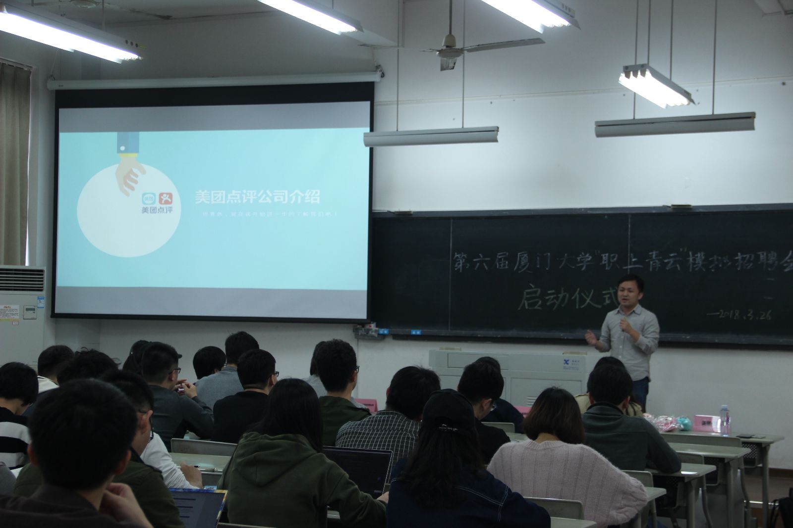 3月26日下午四点四十分,厦门大学软件学院第六届“职上青云”模拟招聘大赛启动仪式在海韵教学楼102教室顺利举行。出席活动的嘉宾和老师有美团点评的游兴旺先生和王蕊女士,厦门吉比特郑松月女士,厦门铃盛软件林琳女士,厦门美柚刘芳芳女士以及软件学院团委副书记李绍玉、辅导员刘茜。