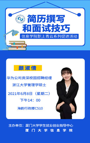 2021年6月8日下午,由厦门大学就业创业指导中心和信息学院联合主办“职上青云”系列分享会在海韵园行政楼C505顺利举办。浙江大学管理学硕士、现任华为公司资深校园招聘经理颜淑倩女士给同学们带来了精彩的简历撰写和面试技巧的分享与指导。活动由2020级硕士生刘姝嫔主持。