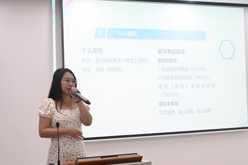 胡羽珊学姐的分享围绕广东省选调生展开,她介绍了选调生考试的考试科目、题型、题数及考试时间,让同学们充分了解了考试相关的信息。强调了笔试备考中刷题和积累的重要性,只有通过大量刷题,保持手感,关心时政新闻,积累素材,方可胸有成竹,考取佳绩。最后,她分享了面试相关技巧,她认面试答题应逻辑清晰,可以模板化但不能过于死板,同时要保持良好的精神状态。
