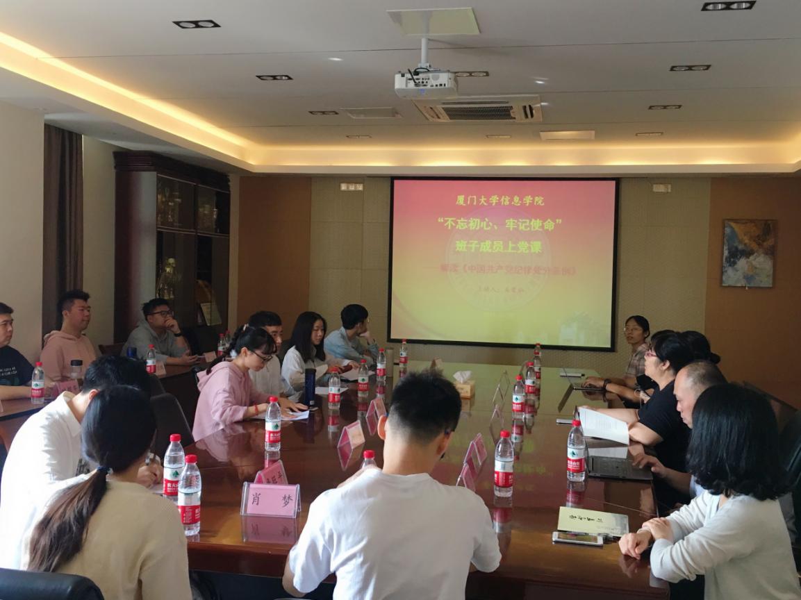 根据“不忘初心、牢记使命”主题教育工作部署,2019年10月30日上午10:00,吴爱仙副院长在海韵C610会议室,以解读《中国共产党纪律处分条例》(以下简称《条例》)为题,为网安系教工党支部和软件工程系硕士生2018级党支部上了一堂生动的党课。