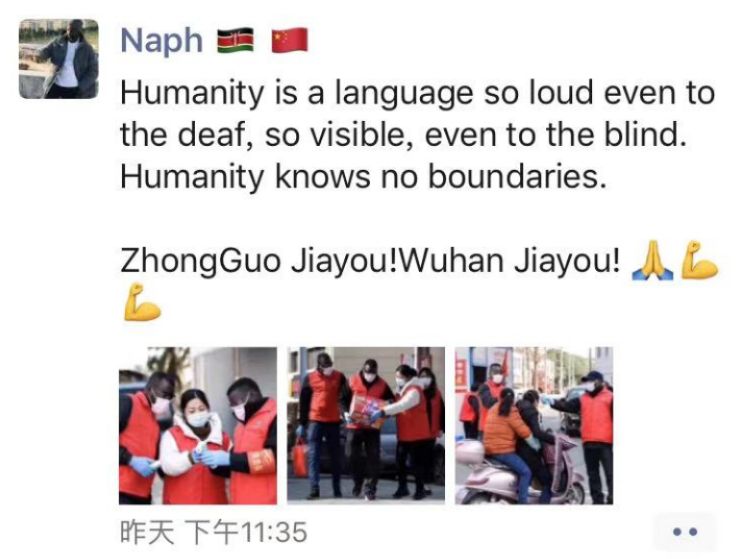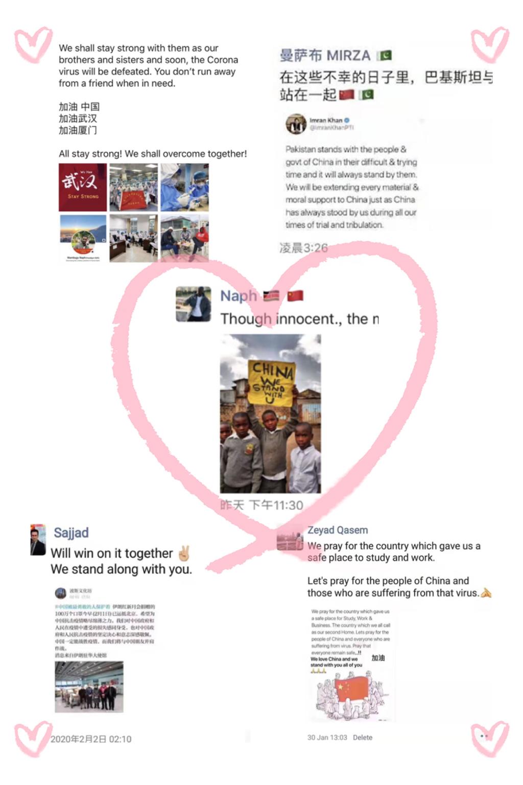 他们的汉语不好,但依旧积极表达,许多海外生自发在微信朋友圈发文,他们向自己的亲人、朋友讲述自己如何受到学校的照顾,以及中国是如何全力以赴抗击疫情,一言一图,真情满满!