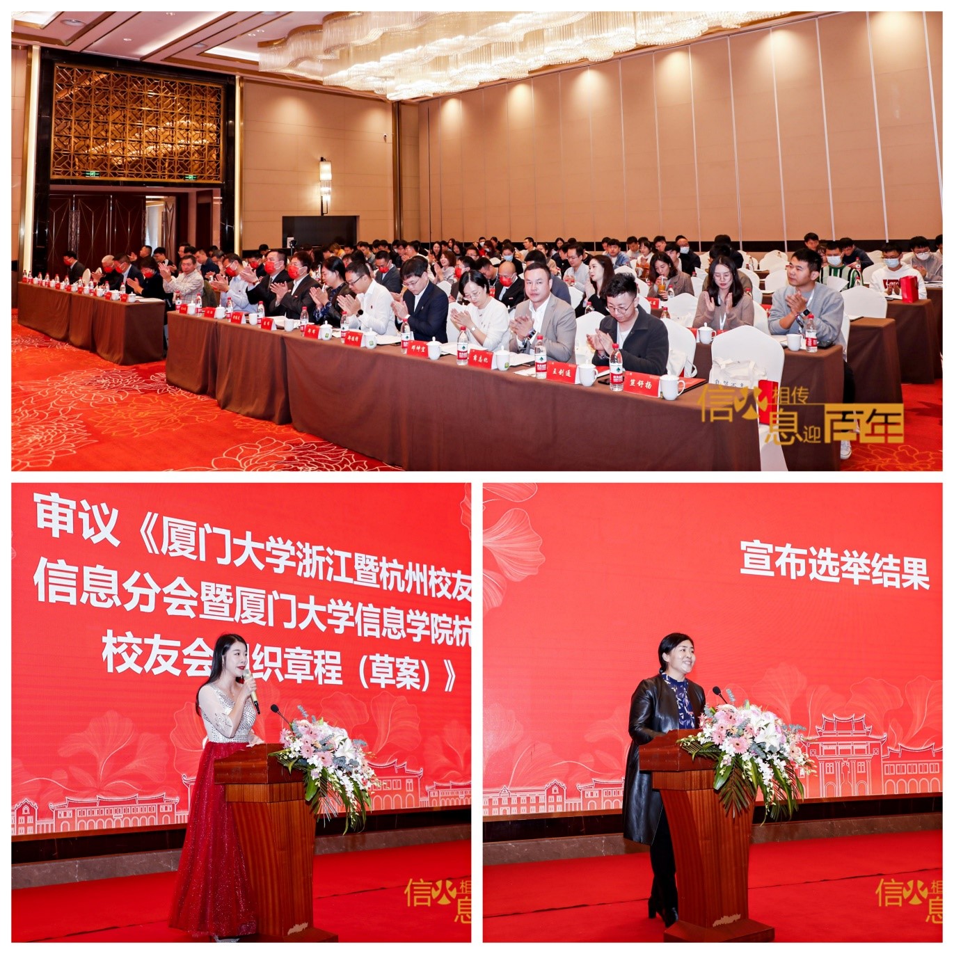 20211114日下午,厦门大学浙江暨杭州校友会信息分会暨厦门大学信息学院杭州校友会成立大会在杭州千越君亭酒店钱江厅隆重召开。厦门大学校友总会副理事长赖虹凯、秘书处秘书长张伟、副秘书长郑辉一行,信息学院党委书记刘、院长舒继武、党委副书记郑镇锋以及各系教师代表,厦门大学浙江暨杭州校友会执行会长徐振晓、秘书长余秀及理事成员、兄弟分会会长,信息学院兄弟校友会秘书长代表出席大会,学院在杭百余位校友齐聚一堂,畅叙母校情谊,共同见证厦门大学信息学院杭州校友会的成立。大会由厦门大学浙江暨杭州校友会外文分会秘书长笪舒扬主持。