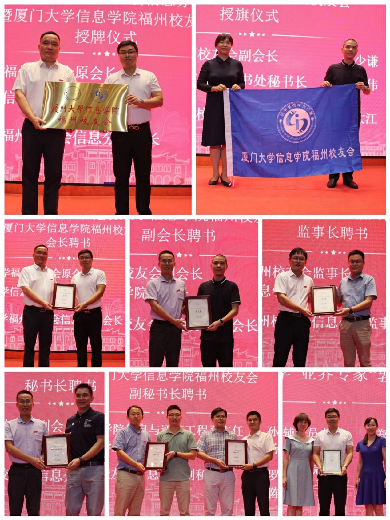 授牌授旗仪式上,叶文振、余少谦、刘弢、张伟代表福州校友会与学校学院向高钦泉、吴大江颁授会牌和会旗,欧如蓉、林东晖、郑镇锋、袁飞、孙海信、杨琦等分别为监事长、副会长、秘书长、副秘书长颁发聘书。