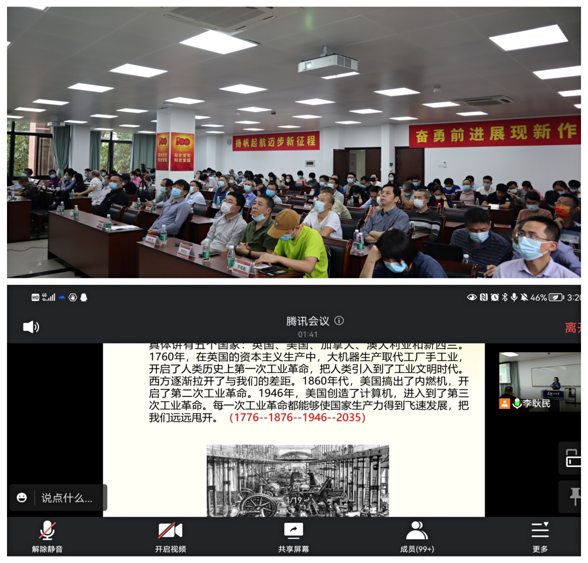 “当代中国马克思主义、21世纪马克思主义,既不能从一般的理论相关性上去理解,也不能从编年史意义的纪事范畴上去解读,而是必须视其为深入揭示时代发展和历史规律的科学范畴,是引领当代中国共产党人守正创新、继往开来,开辟马克思主义中国化新境界的科学论断。”石教授表示,要深刻认识到当代中国马克思主义、21世纪马克思主义科学内涵的核心意蕴,就是将中国主题融入时代主题,促使两者有机统一;其基础意蕴,就是把中国发展融入世界发展,促使两者良性互动;其开放意蕴,就是让中国精神融入时代精神,从而促使为民族谋复兴和为世界谋大同有机统一。石教授的讲解高屋建瓴,内涵丰富,深入浅出,语言生动、感染力强,与会师生受益匪浅。
